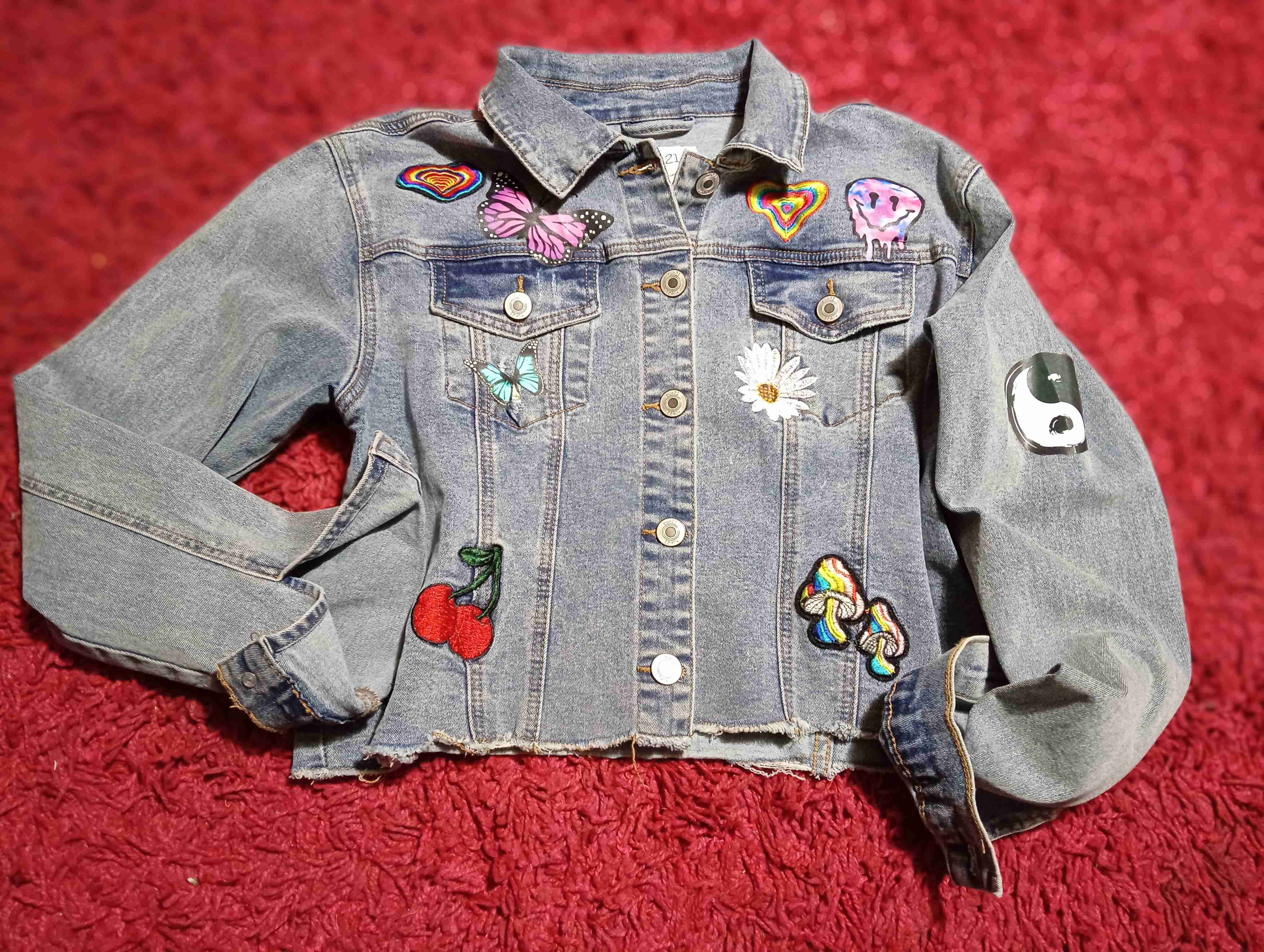 Chaqueta de mezclilla con parches coloridos, estilo juvenil y moderno. En buen estado, ideal para días casuales.