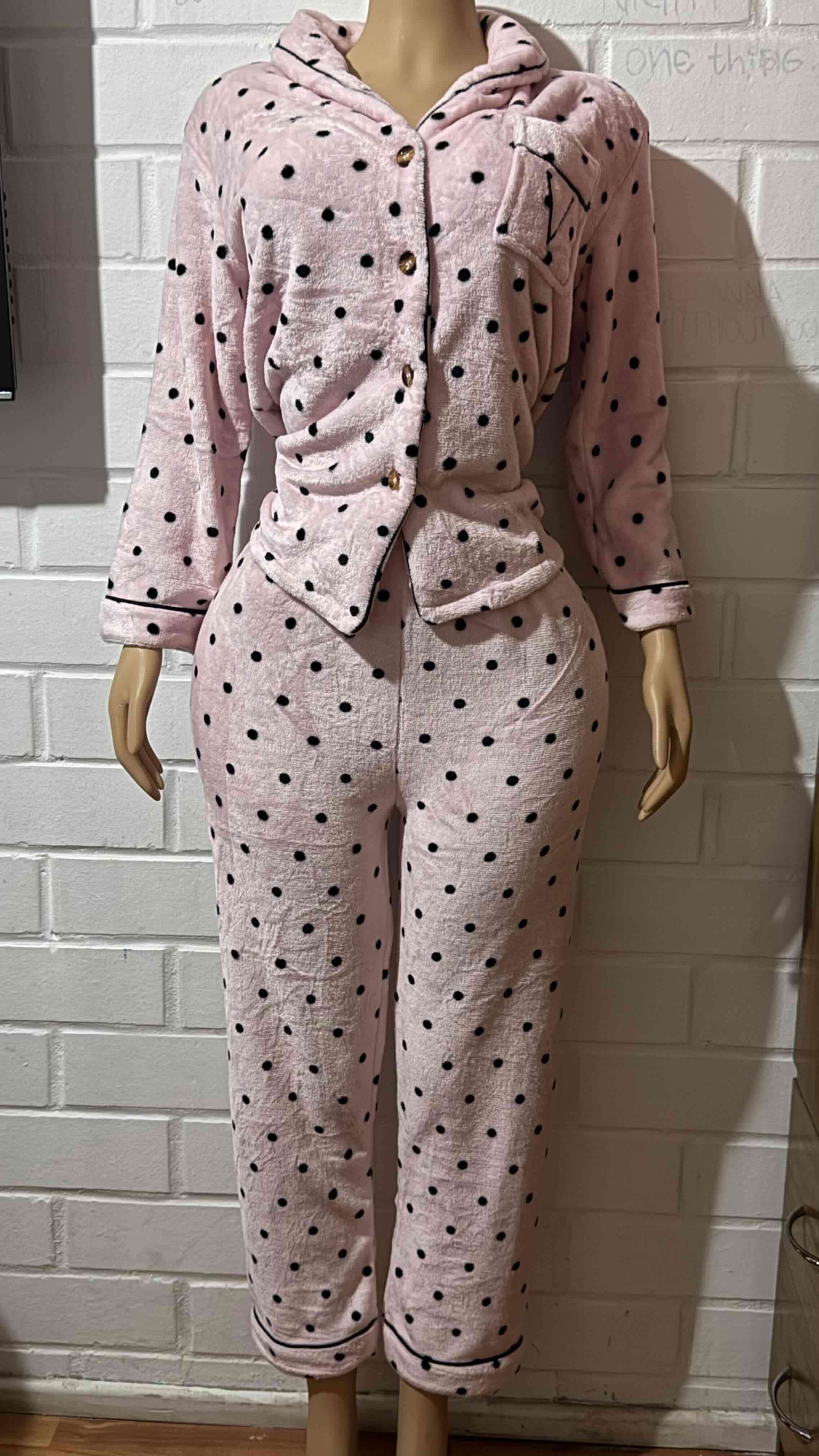 Pijama cómodo de dos piezas color rosado con lunares negros ideal para descansar en casa. En buen estado. Talla S/M