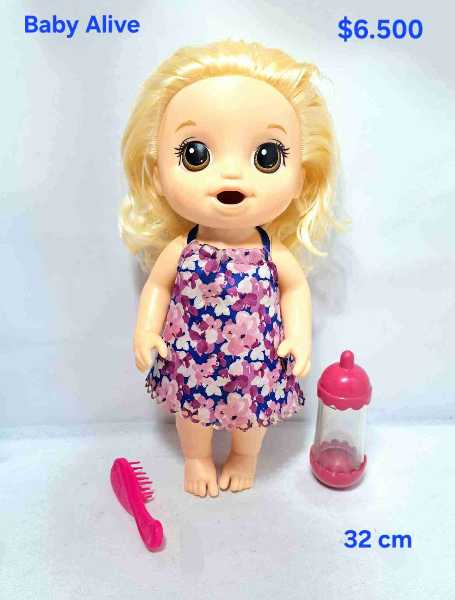 Muñeca Baby Alive con vestido floral. Incluye peine y biberón. Ideal para el juego de roles.