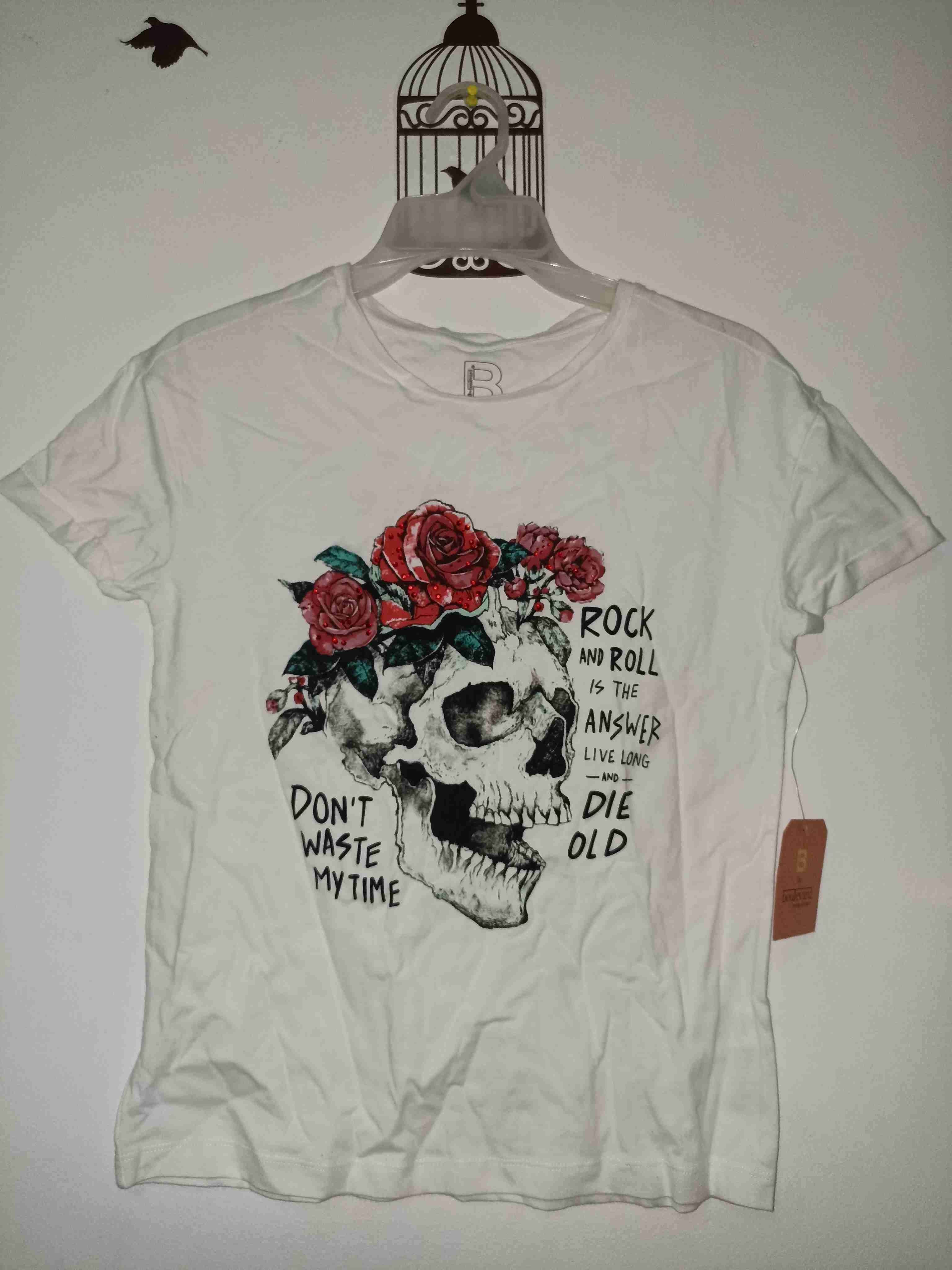 Polera blanca de manga corta con diseño de calavera y rosas. Perfecta para un look casual y relajado. En buen estado, con signos leves de uso.