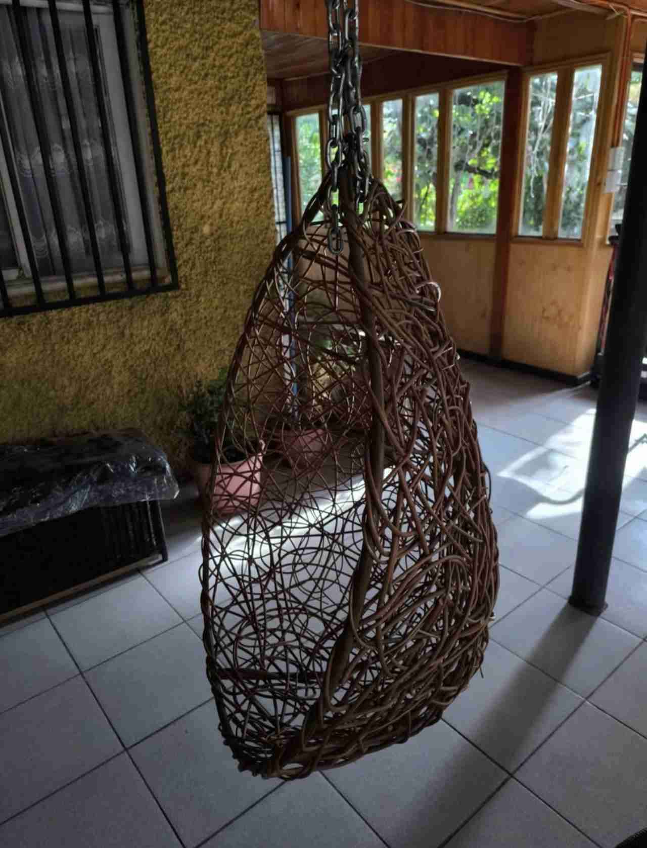 Silla colgante ideal para terrazas. Hecha de mimbre en buen estado, perfecta para relajarse.