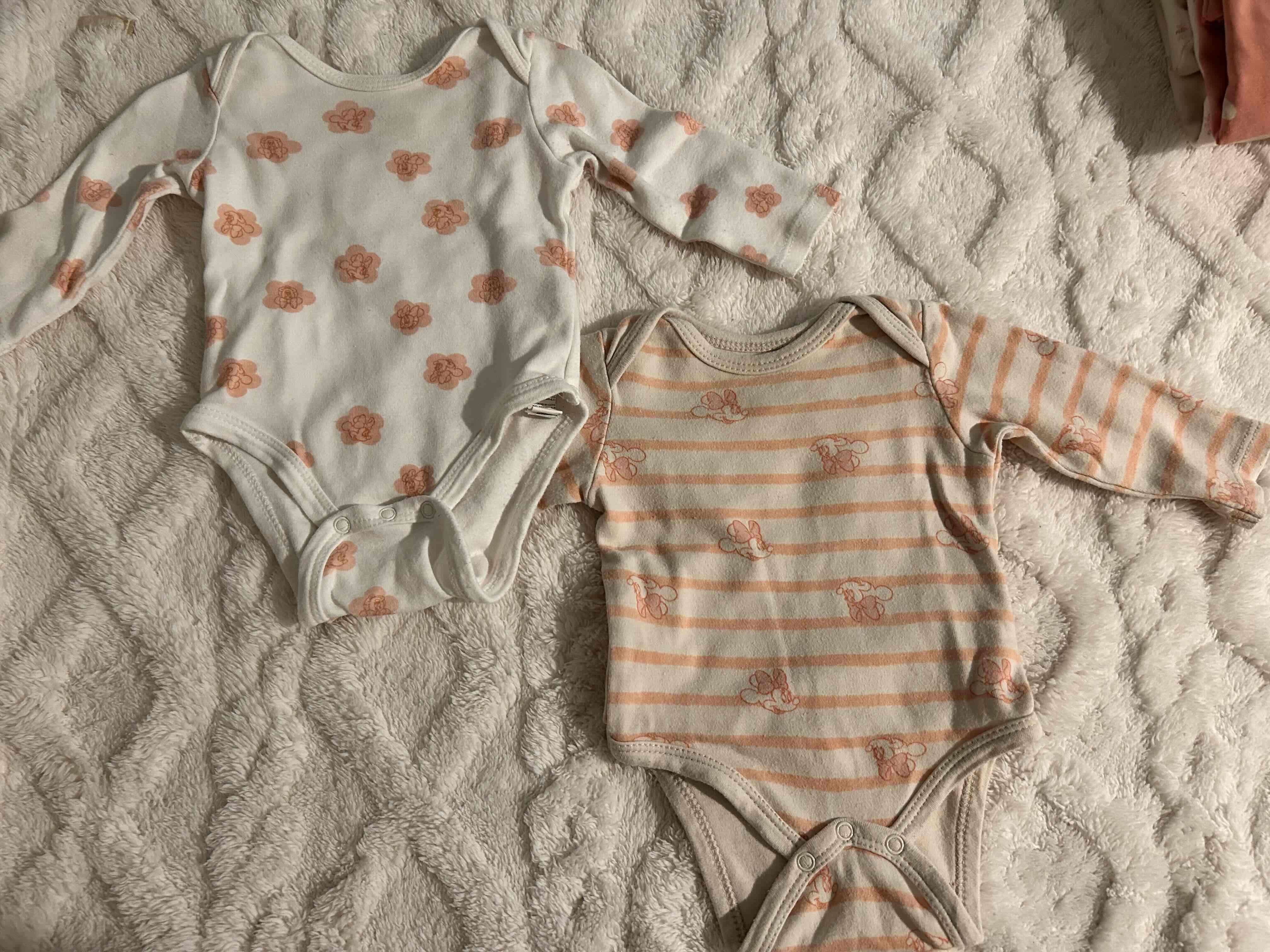 Conjunto de bodys de bebé en tonos crema y estampados naranjas. Perfectos para el uso diario. En buen estado.