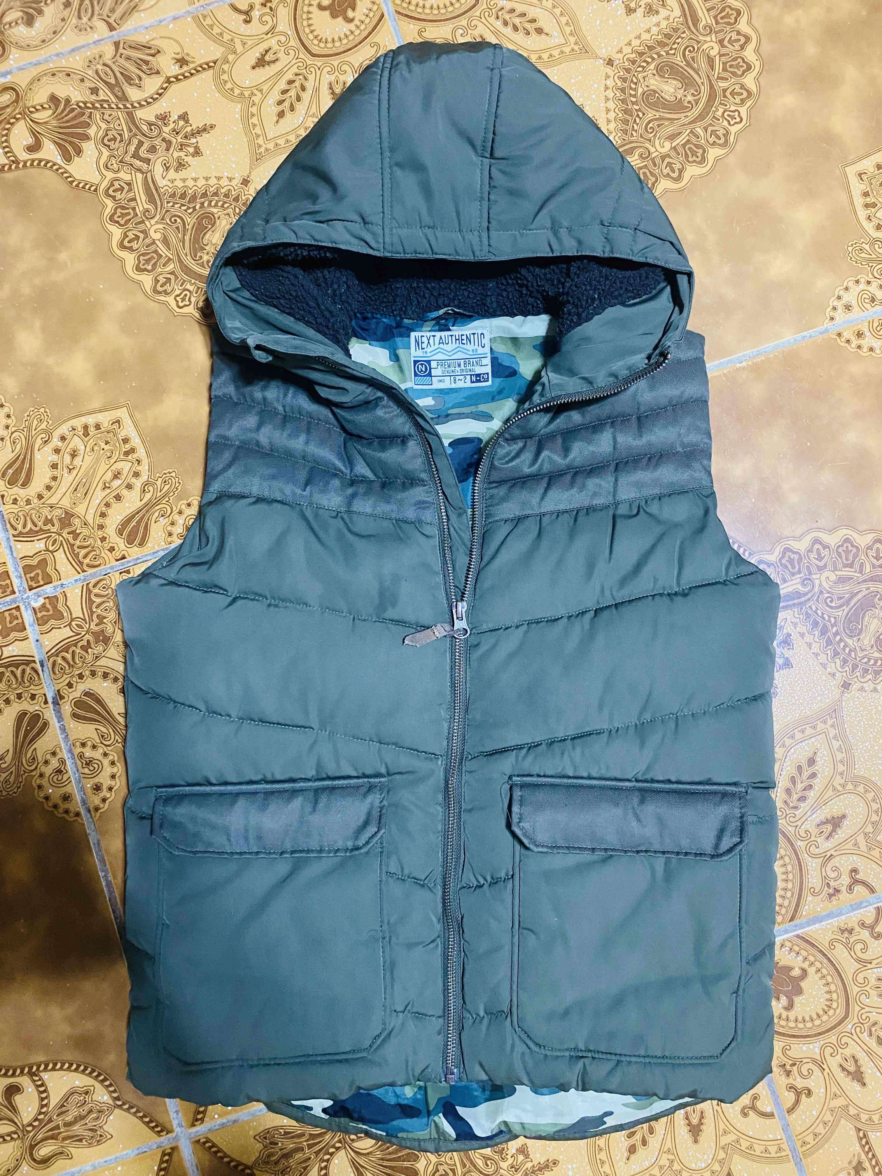 Chaleco sin mangas color verde, ideal para días fríos. Con capucha y bolsillos frontales.