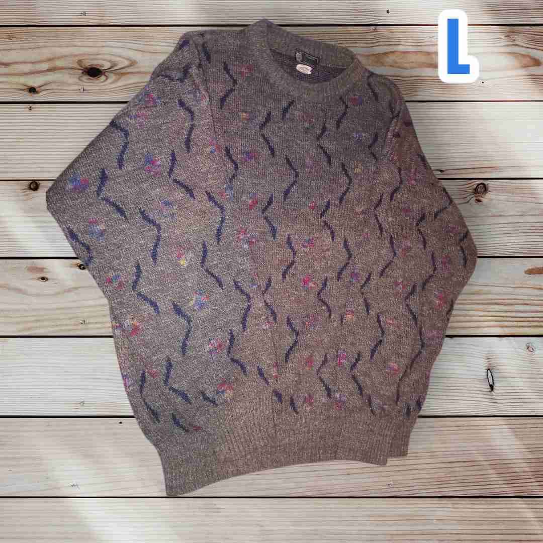 Suéter marrón con diseño de líneas onduladas. Ideal para abrigarse en invierno.