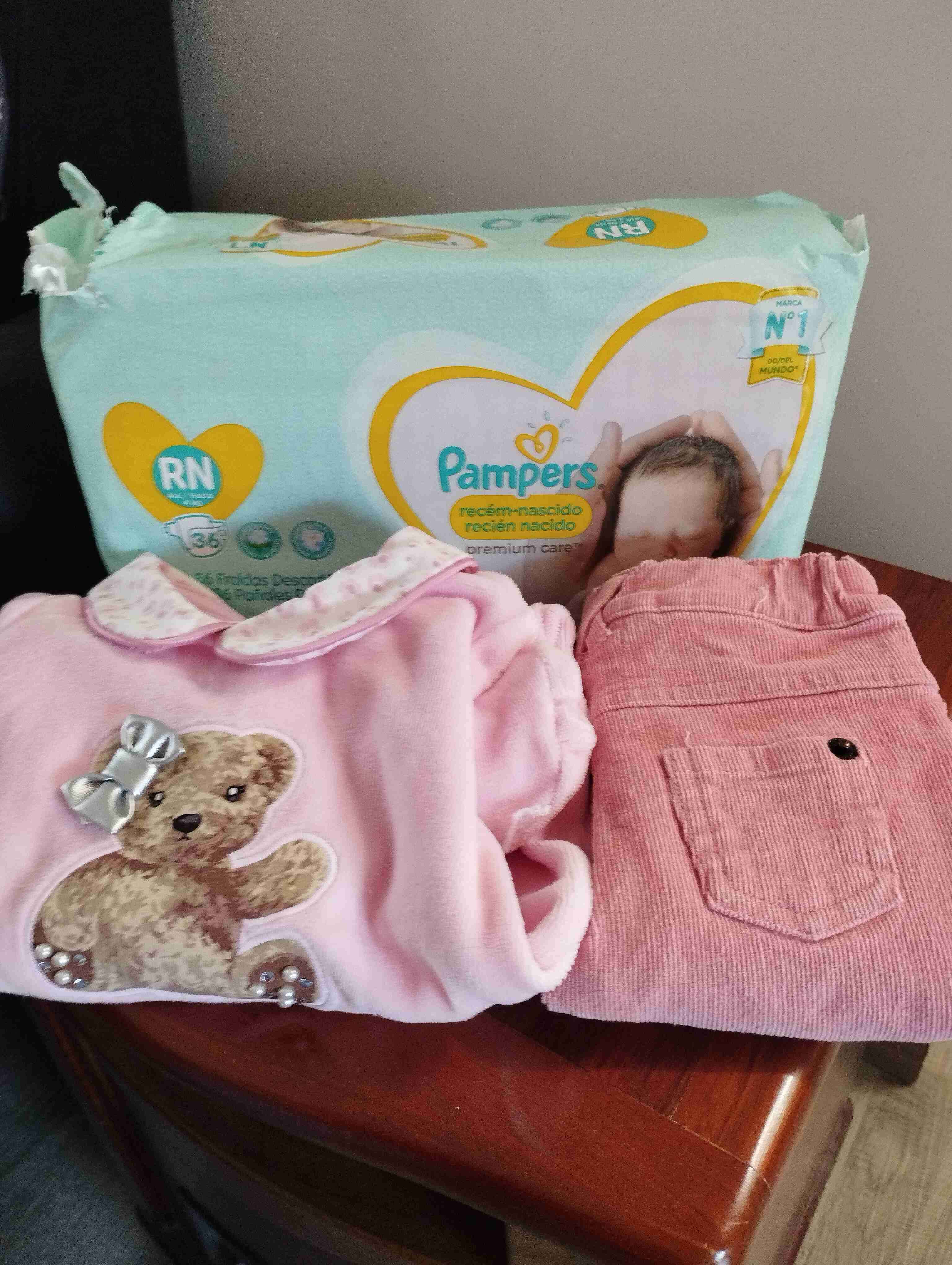 Pack de ropa y pañales (paquete abierto) de bebé recién nacido. Incluye: - Osito de plush marca Limonada talla 0 mes. Usado solo una vez. Como nuevo sin manchas, broches perfectos. - Pantalón cotelé con forro marca Opaline talla RN. Usado solo una vez tambien. Impecable. - Paquete abierto de pañales Pampers Premium Care RN (hasta 4 kilos. Le quedan 31 pañales. Todo en $10.000. Entrega solo presencial en Chiguayante.