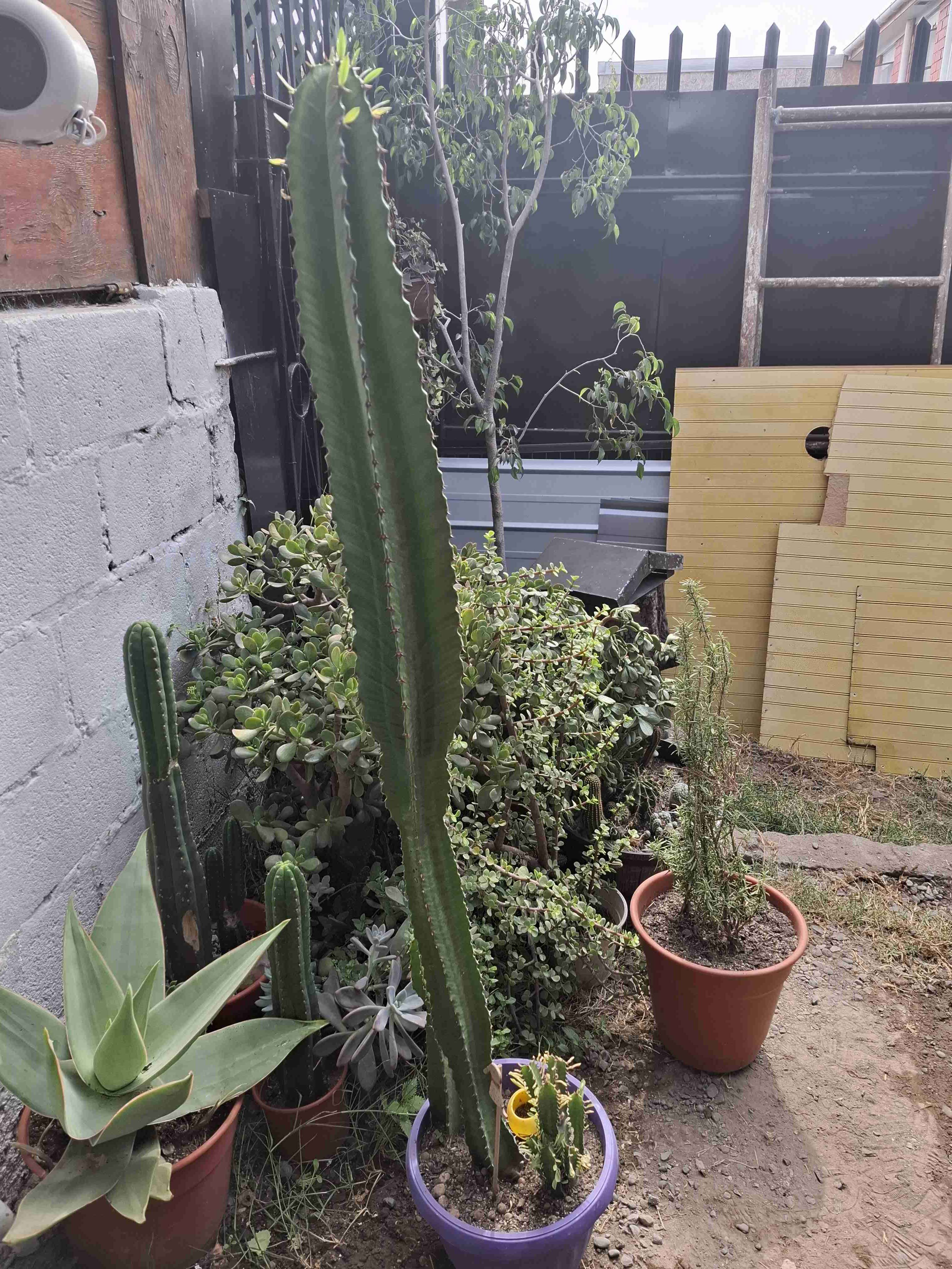 Cactus Candelabro alto en maceta morada, ideal para decoración del jardín. Buen estado, con muchas espinas.