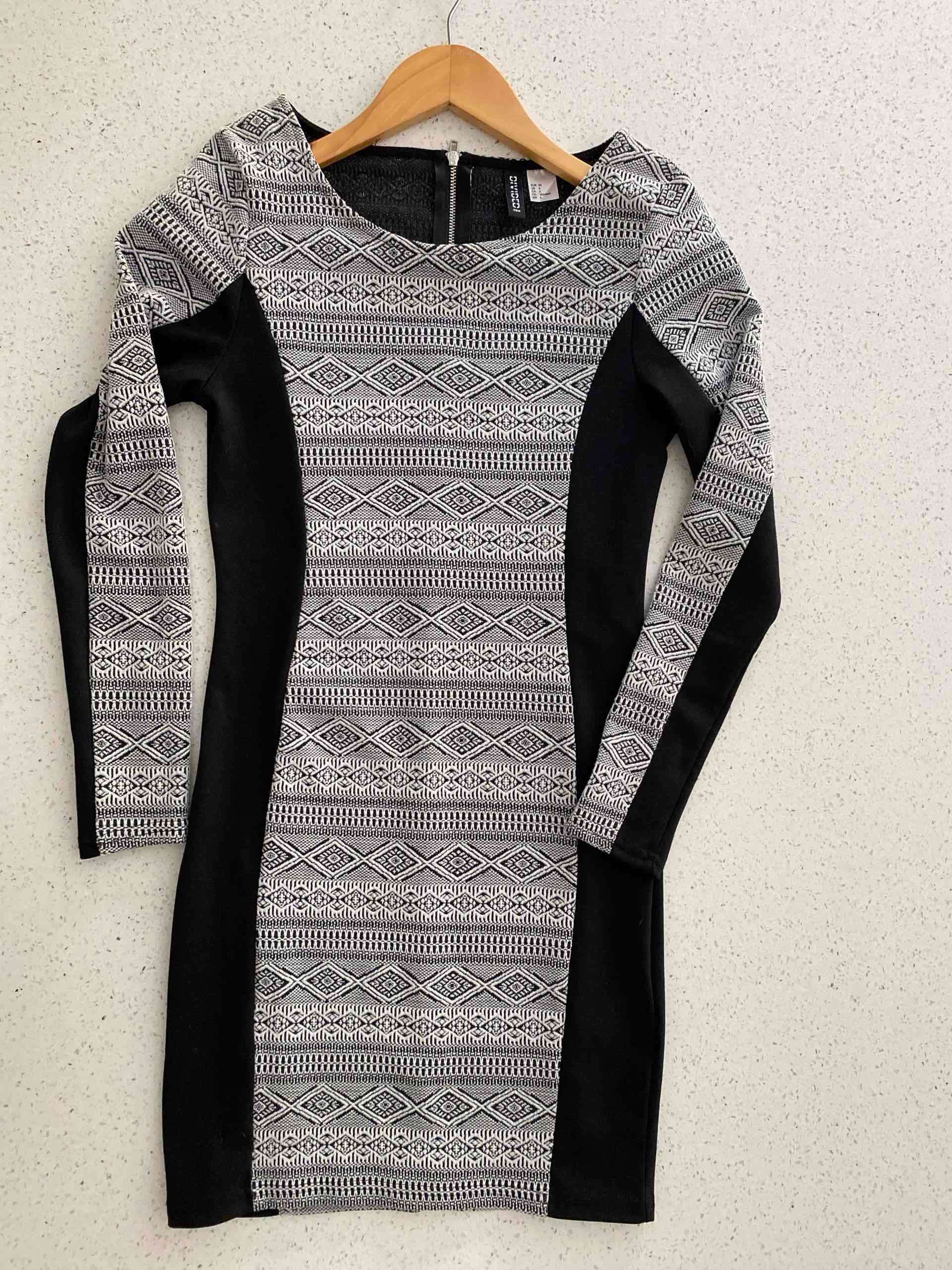 Vestido ajustado con patrón geométrico en tonos negro y gris. Elasticado talla 36 pero da hasta un M