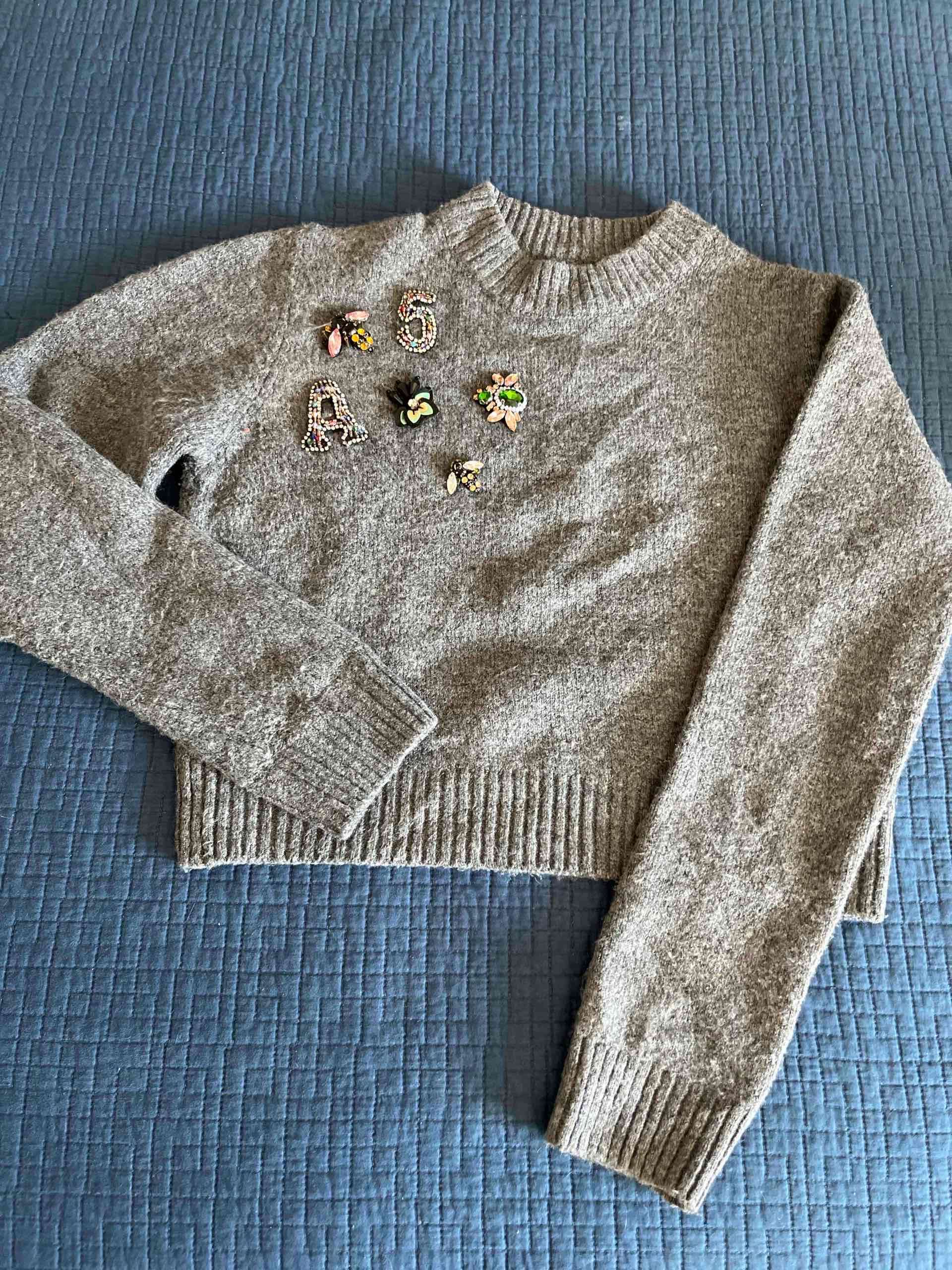 Suéter gris de lana con bordados decorativos. Ideal para días frescos, en buen estad.