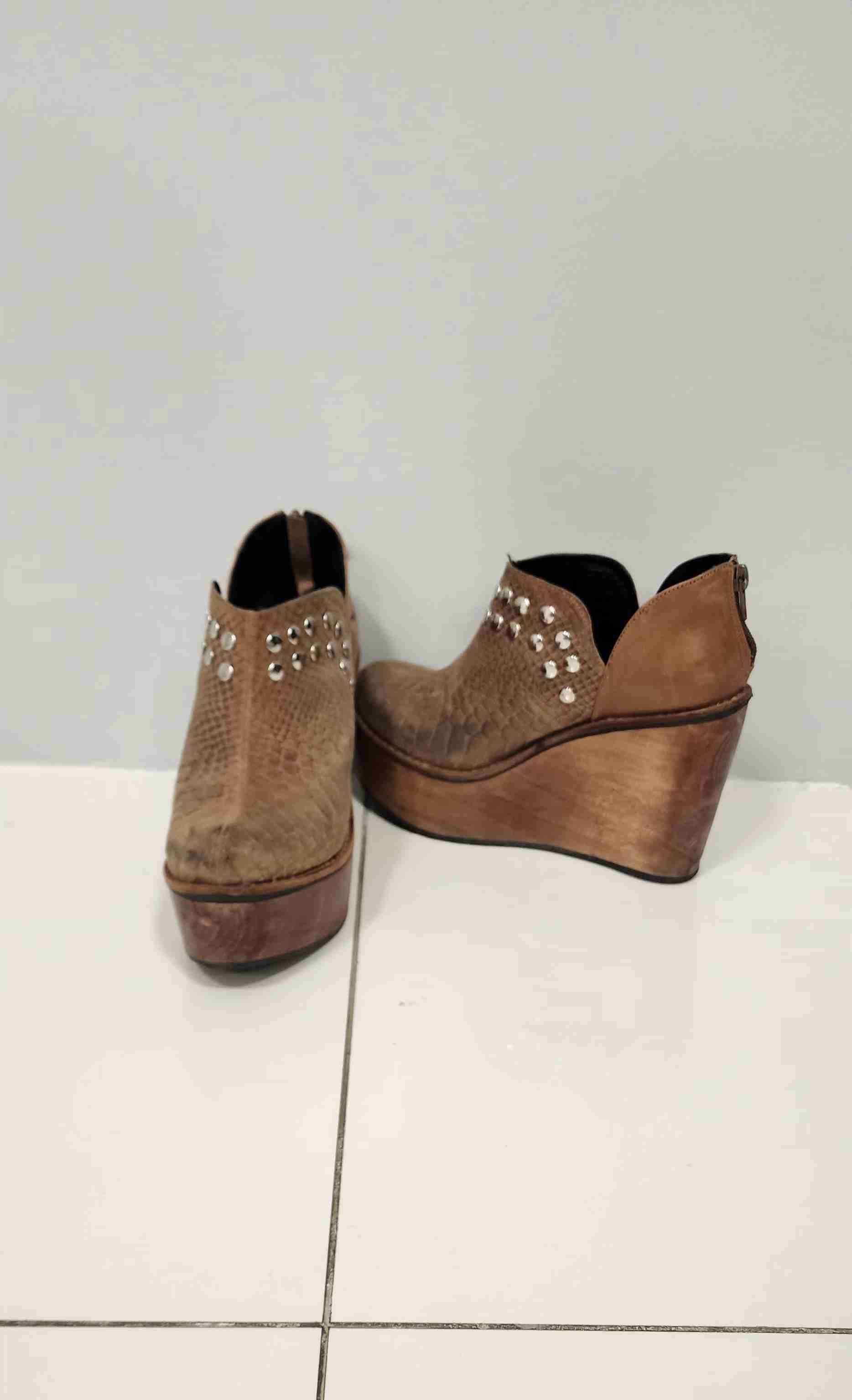 Botines de cuero marrón con plataforma robusta y tachas decorativas. En buen estado, ideales para un look casual con estilo. Número 36