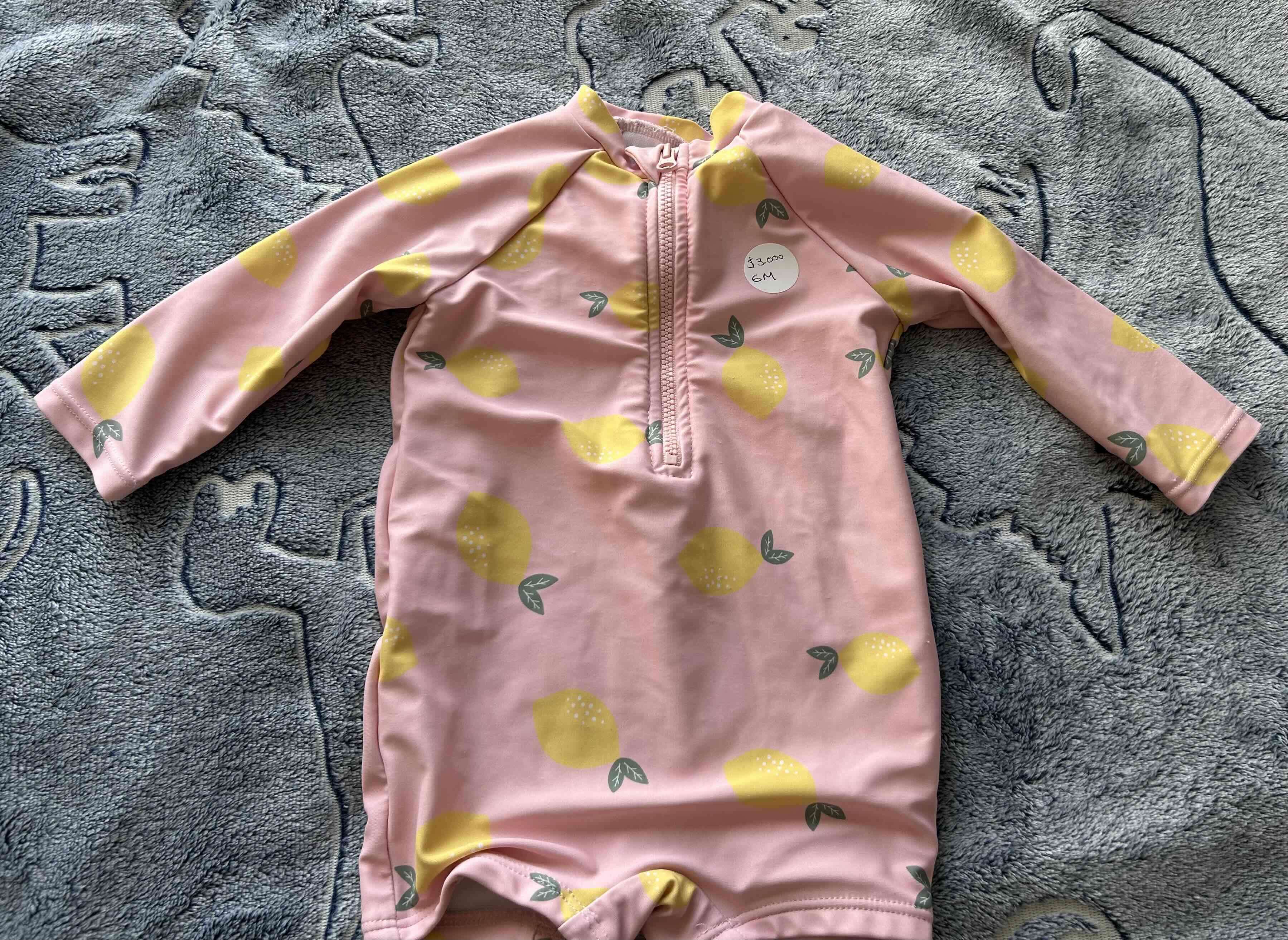 Enterito de baño para niña, diseño rosado con limones amarillos. Ideal para proteger del sol durante el verano. 6M
