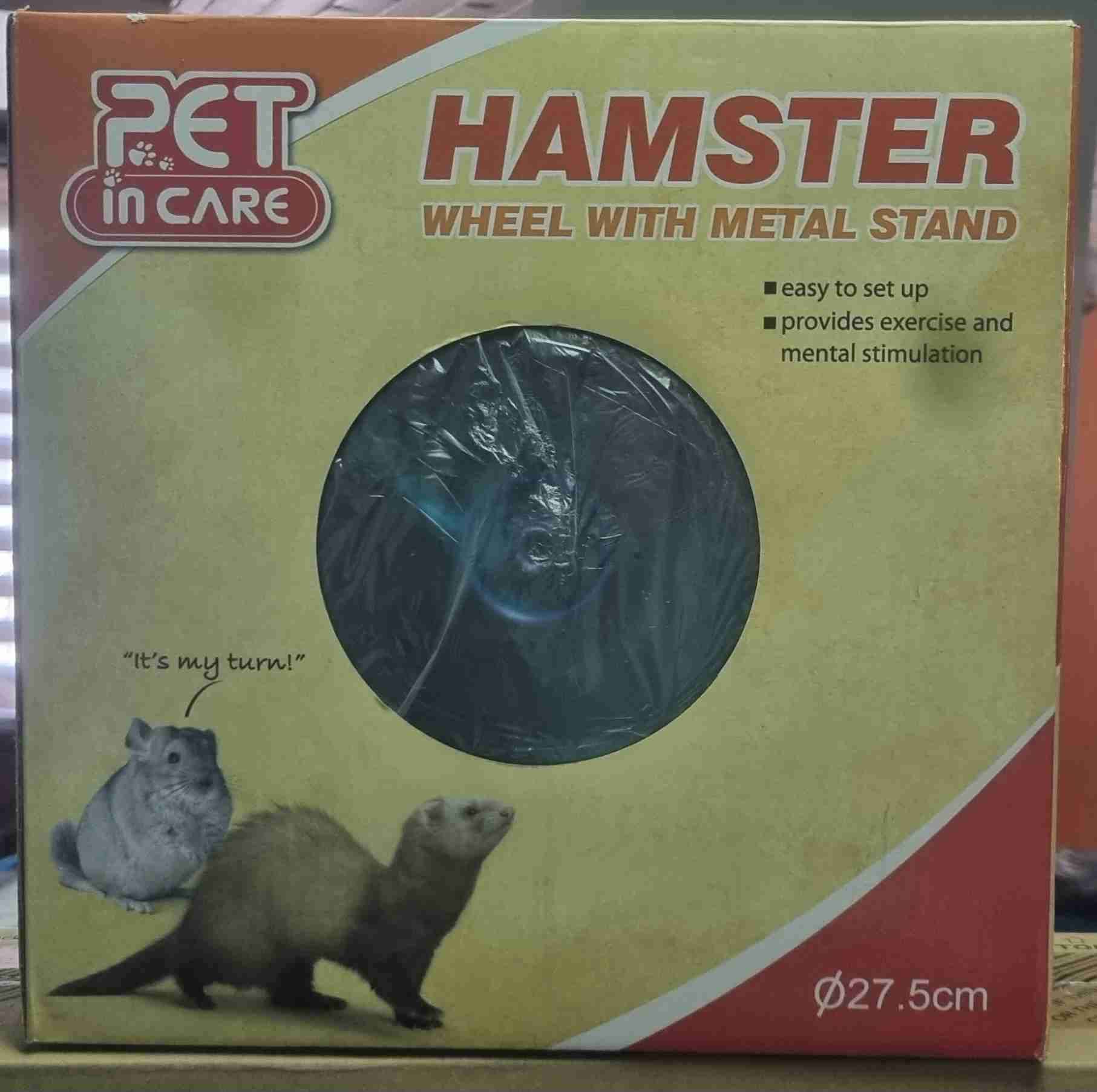 Rueda de ejercicio para hámster con soporte metálico, fácil de armar. Ideal para ejercicio y estimulación mental.