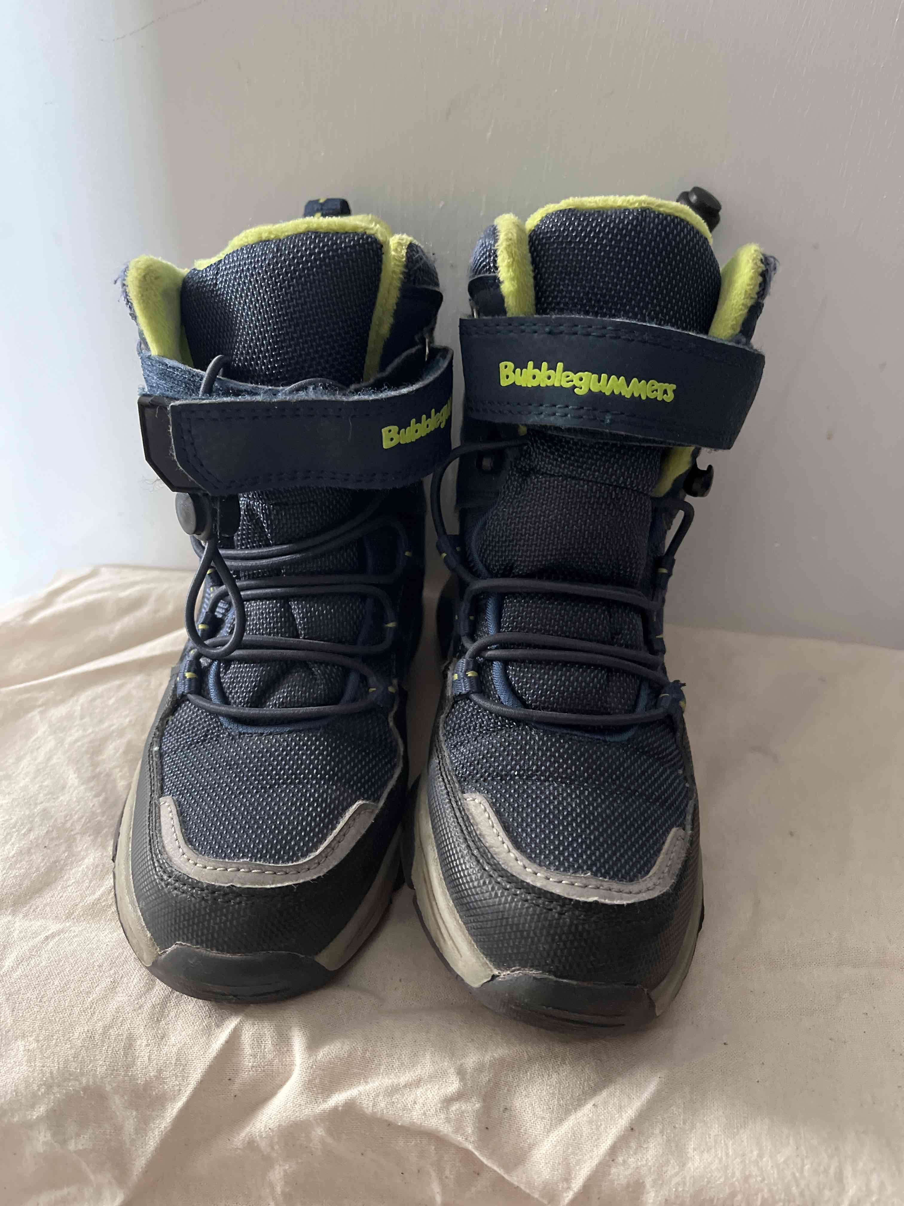Botas infantiles azul oscuro con detalles verdes.forrado con polar por dentro ideal para inviernos son resistentes al agua Perfectas para el invierno. excelente estado general.muy poco uso pero se ven asi porque llevan harto tiempo guardado.talla 31-