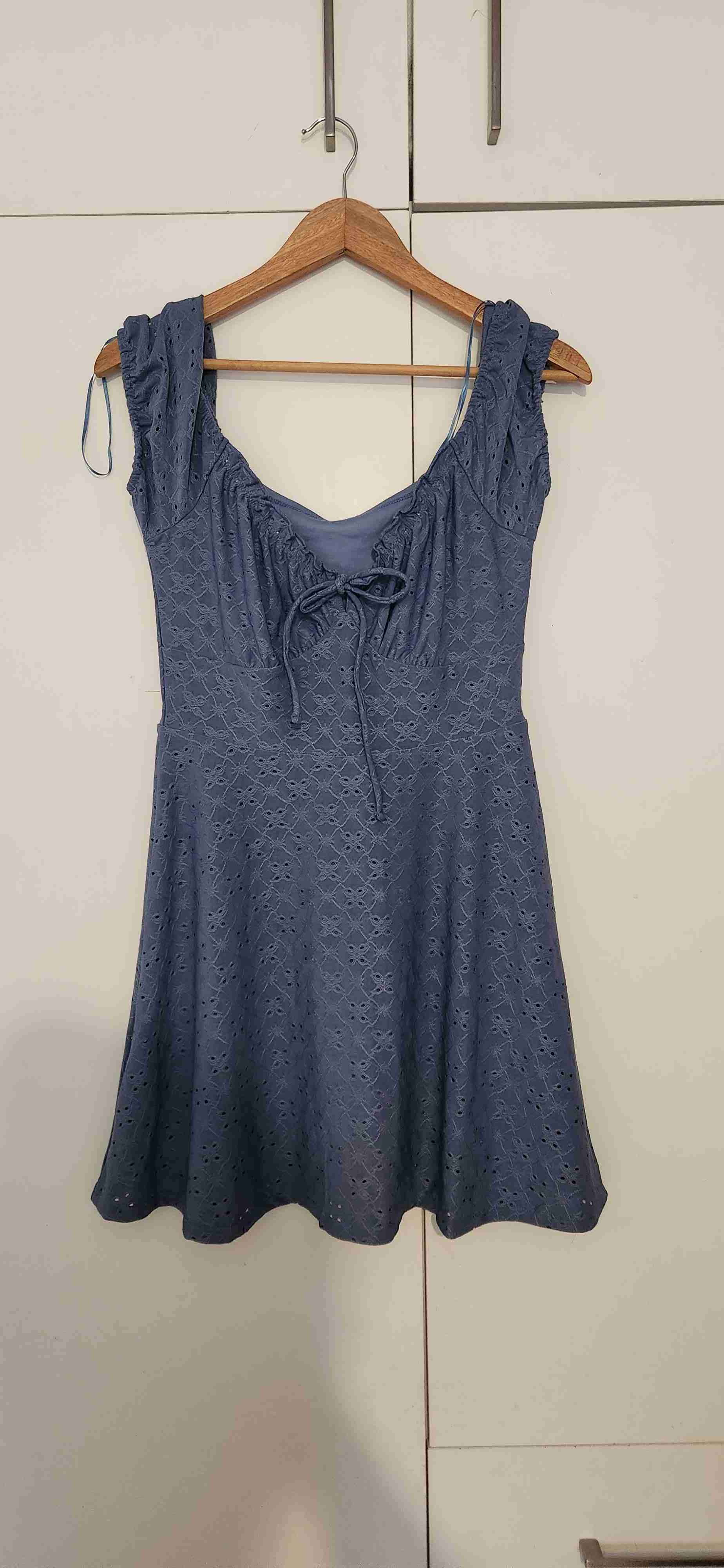 Vestido azul de encaje en buen estado, perfecto para ocasiones casuales. Diseño con lazo en el pecho.