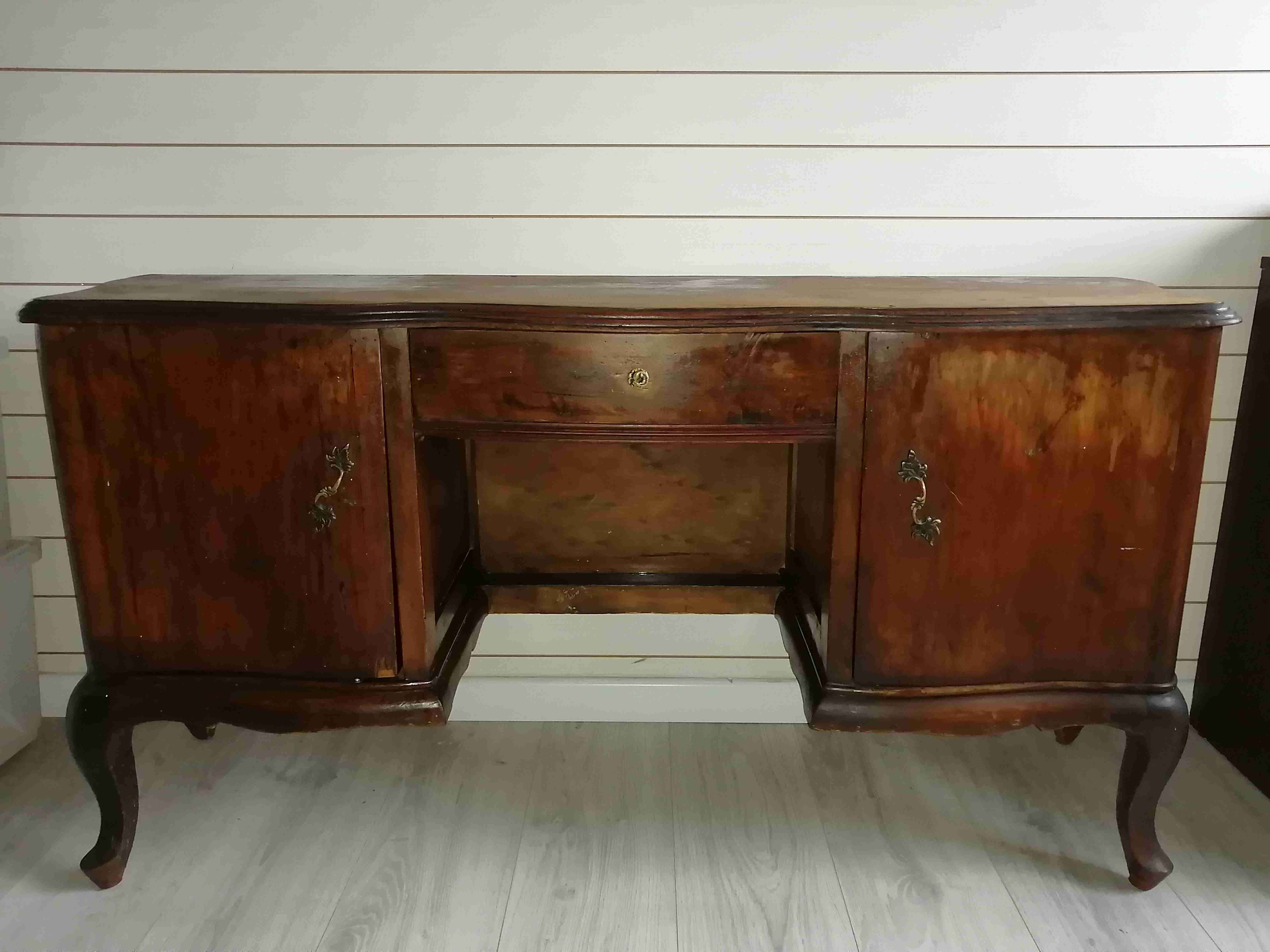 Aparador de madera con diseño clásico, ideal para decorar tu comedor. Estado general aceptable, con signos de uso visibles.