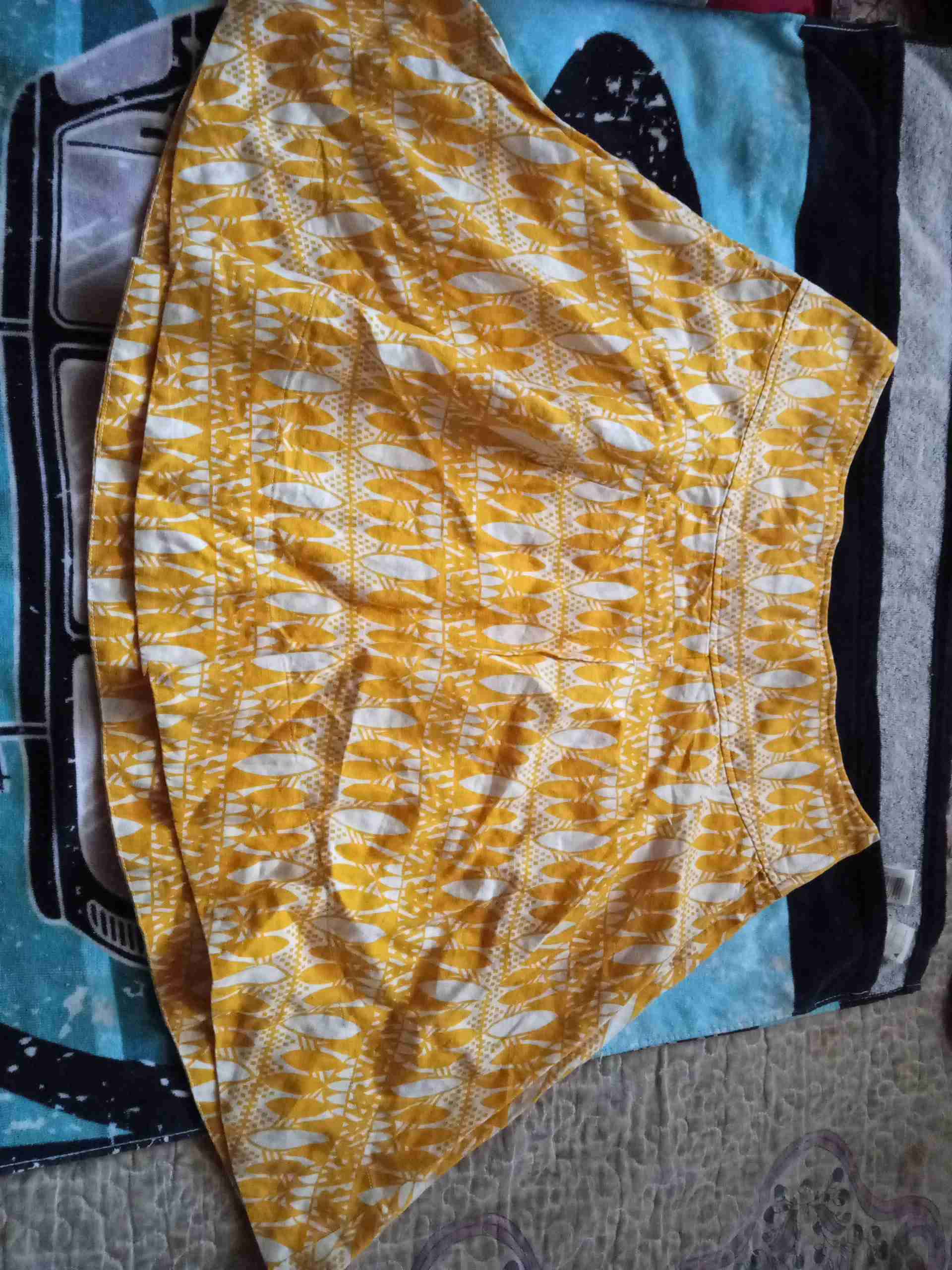Falda fresca de color amarillo con diseño geométrico, ideal para días de verano. En buen estado.