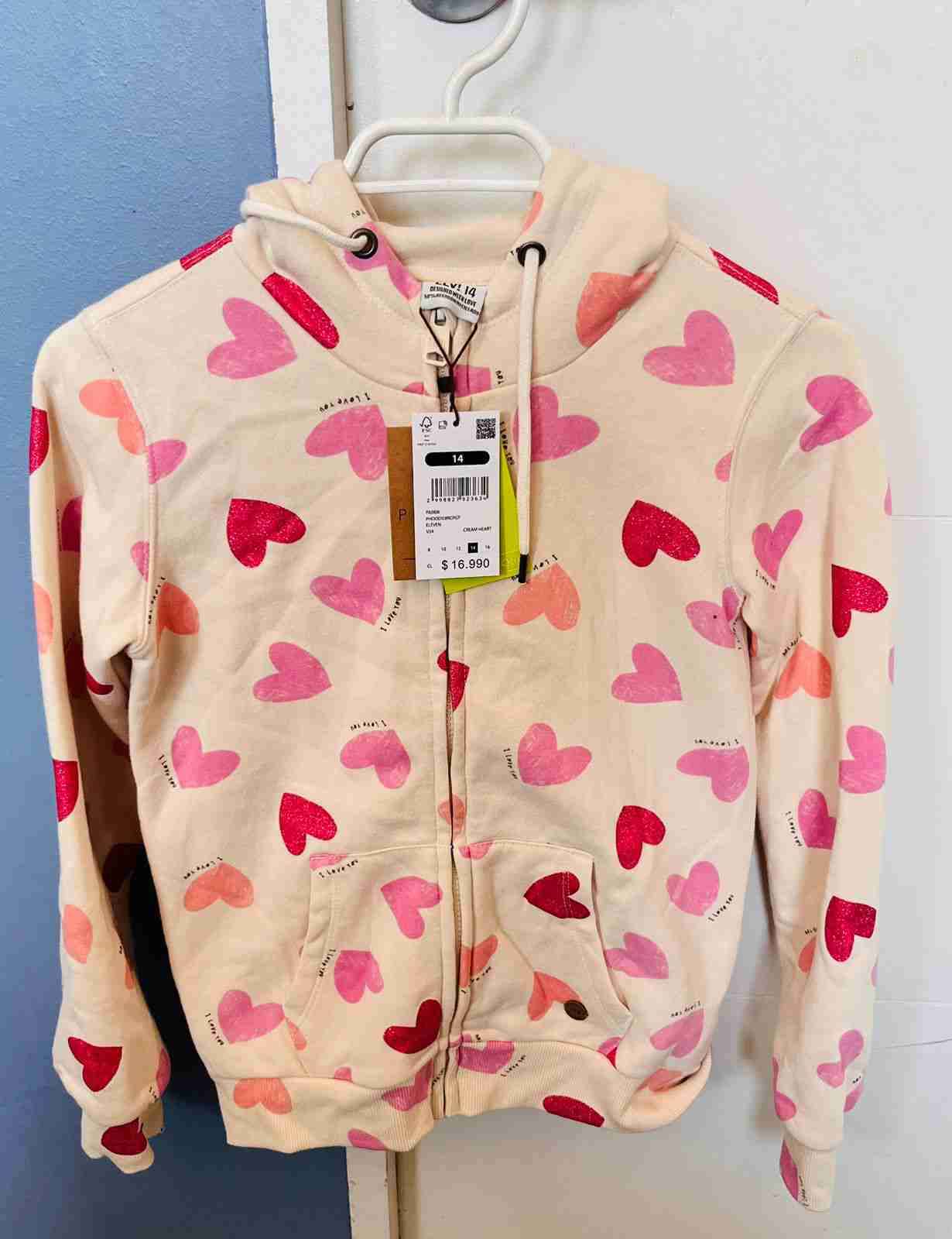 Polerón infantil con capucha, diseño de corazones rosados y rojos. Nuevo con etiqueta, ideal para el invierno. Talla 14