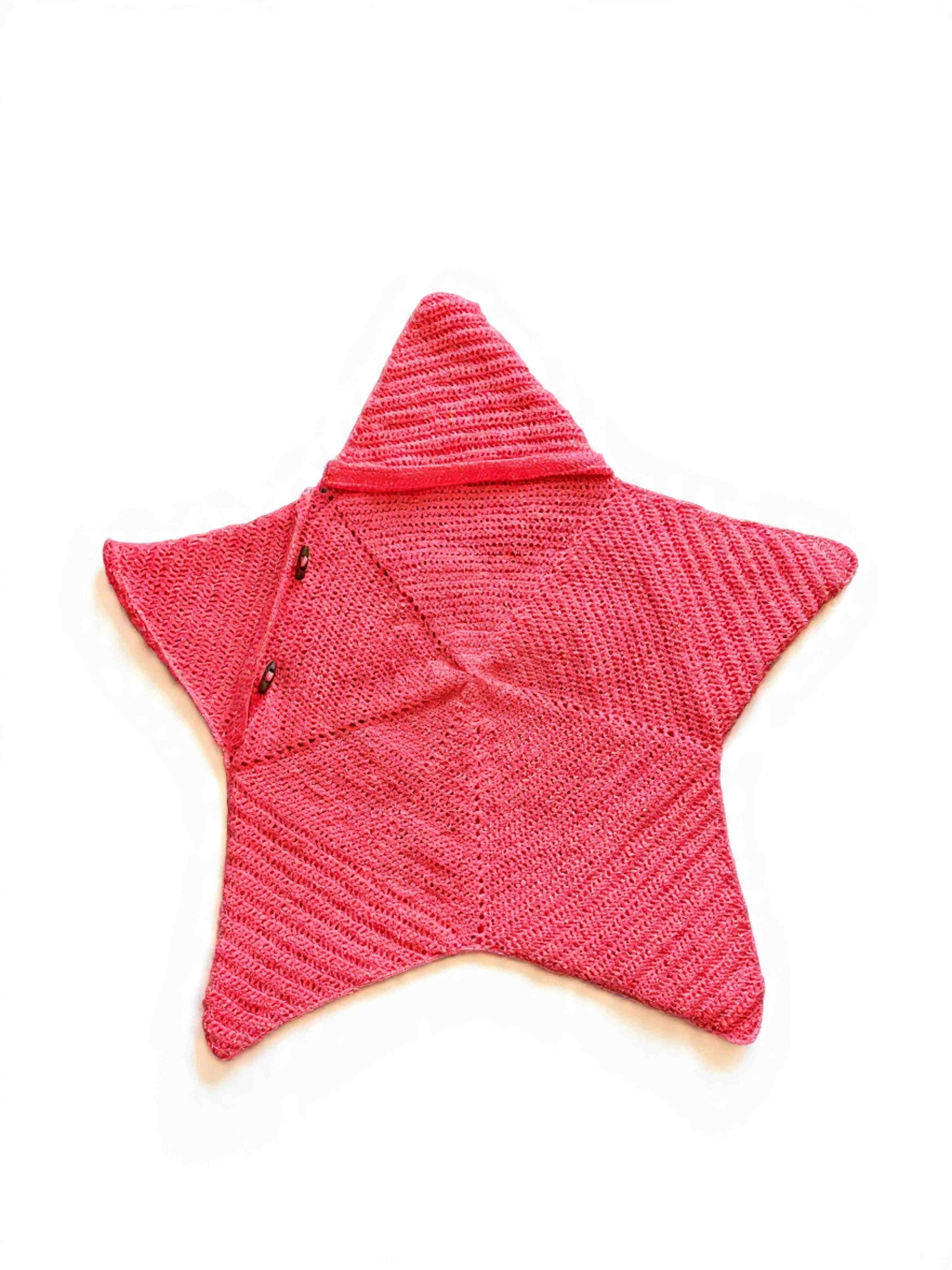 Saco tejida rosa en forma de estrella, ideal para abrigar al bebé. Buen estado, suave y acogedora.