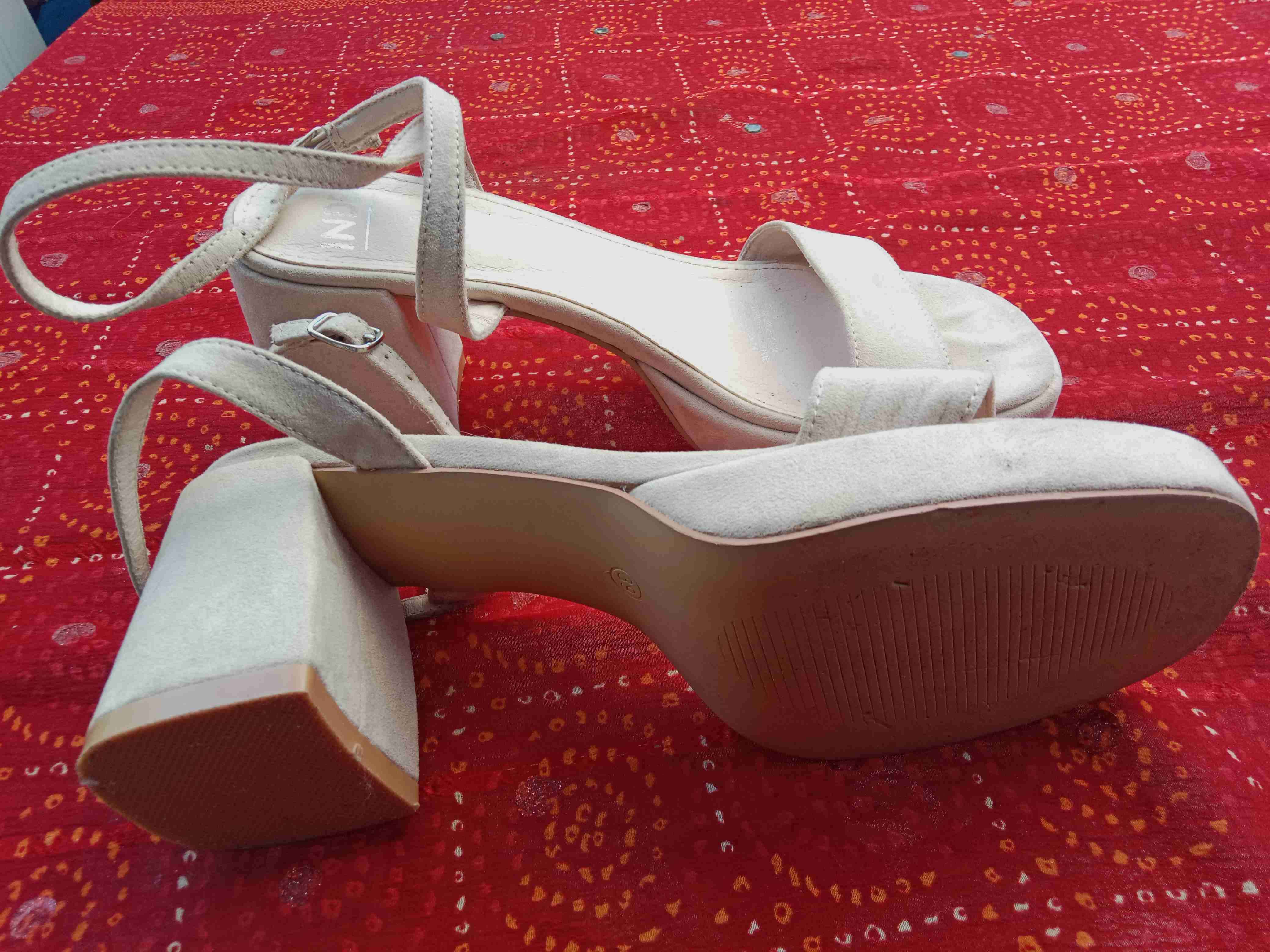 Sandalias elegantes de taco ancho en color blanco, ideales para eventos formales. Ligeros signos de uso pero en buen estado. Solo se uso para una ceremonia