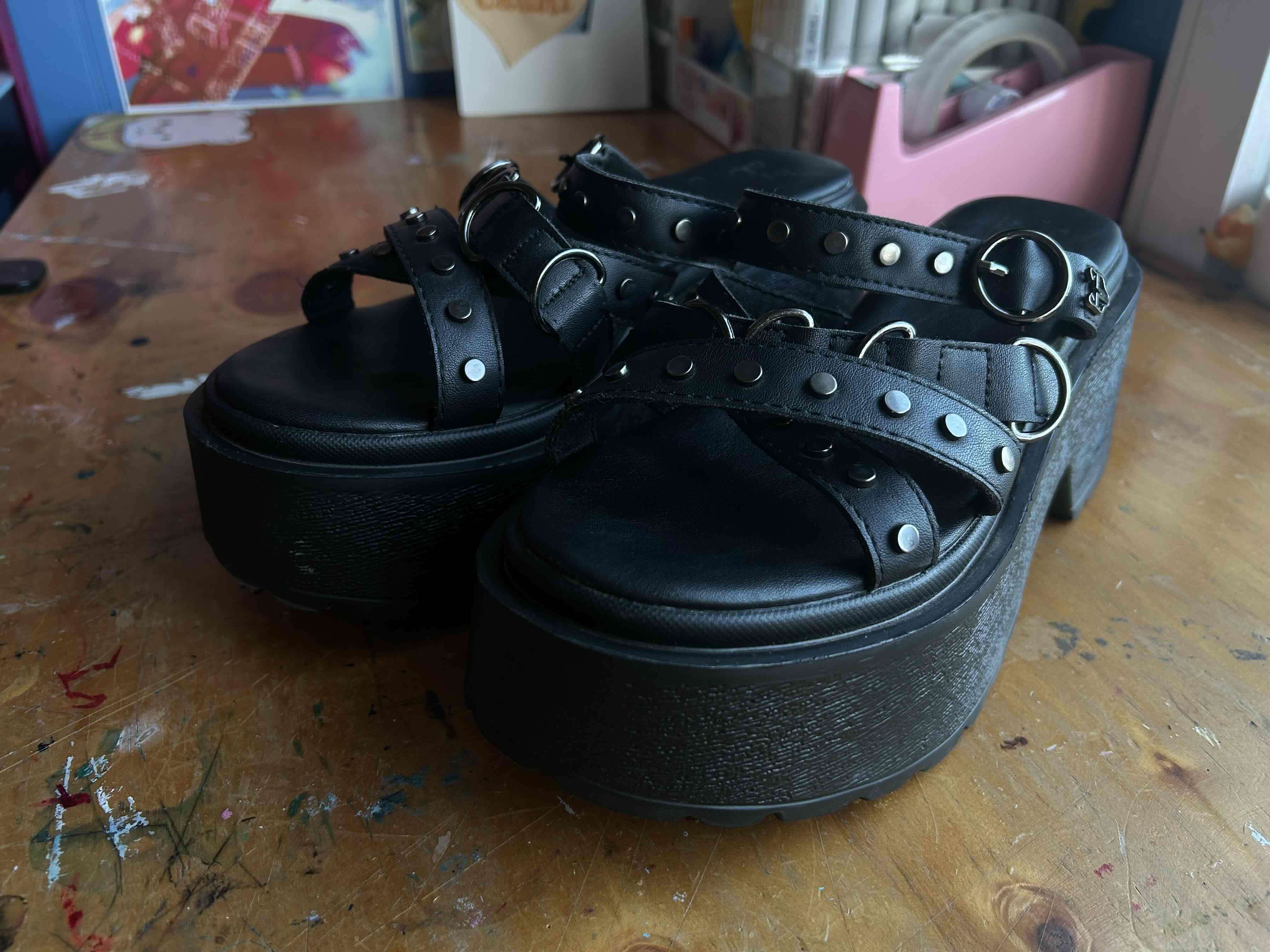 Sandalias de plataforma negras con detalles de tachas y hebillas metálicas. Estilo moderno y en excelente estado, solo dos usos.