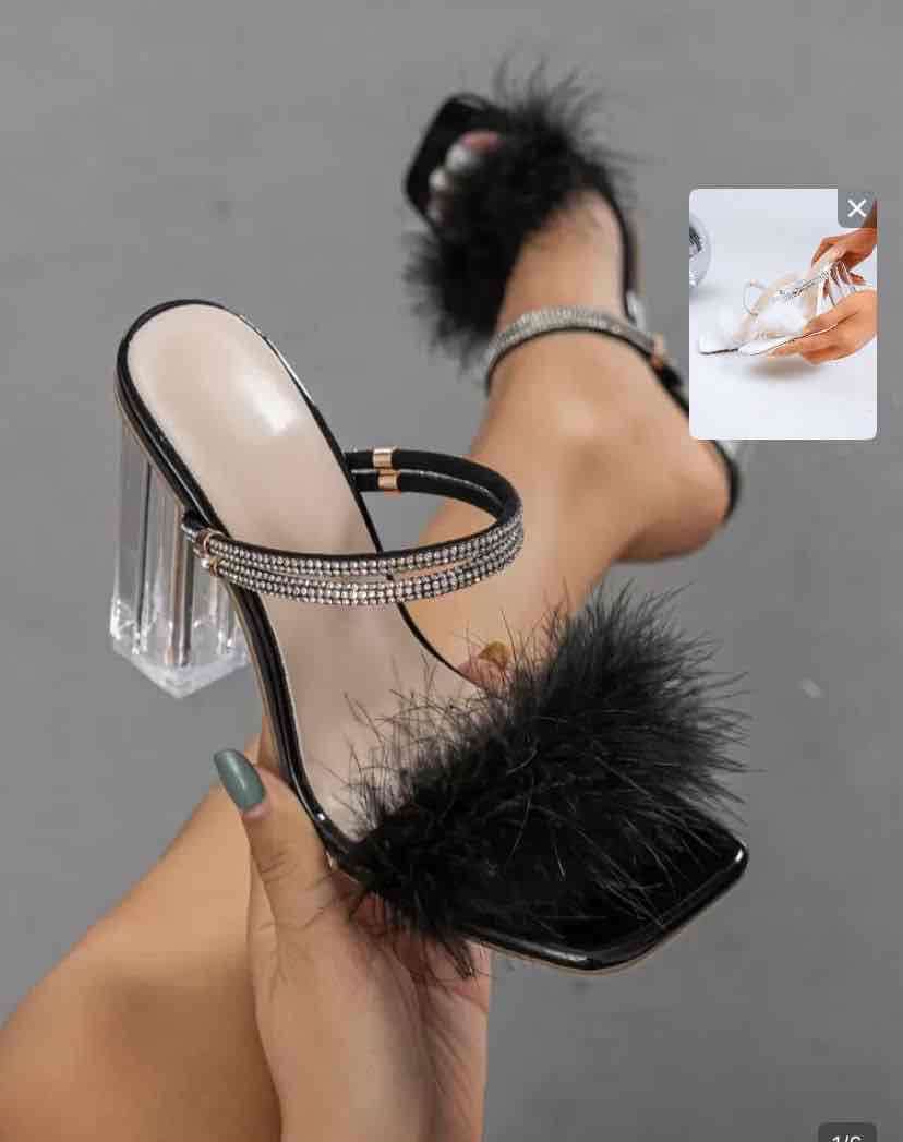 “Sandalias negras elegantes con plumas y tacón transparente. Están prácticamente nuevas, solo se probaron una vez, pero no me quedaron bien me queda chica. Sin uso, en excelente estado. Ideales para eventos o salidas especiales.”