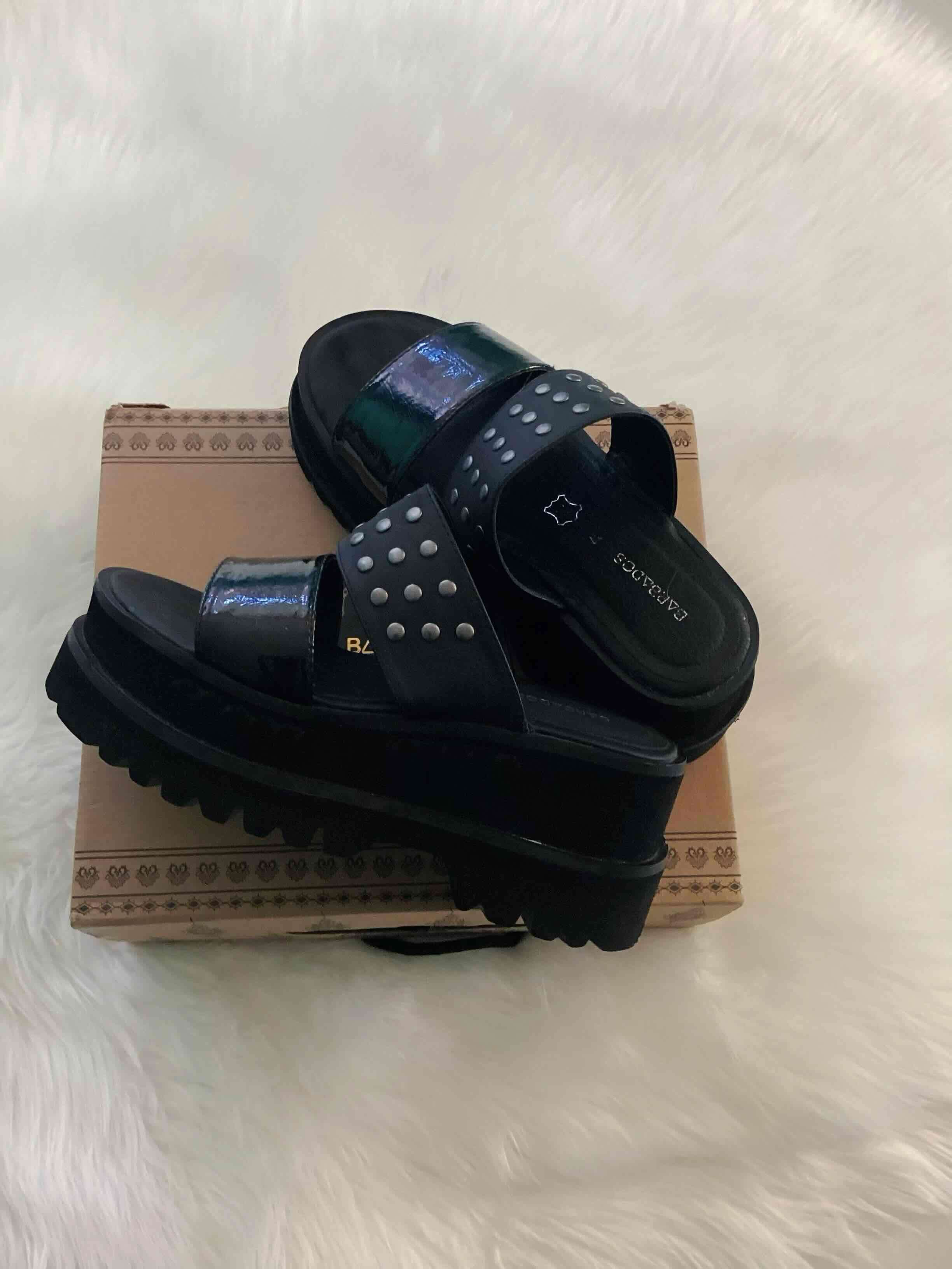 Sandalias de plataforma negras con detalles de tachuelas, modernas y cómodas. En buen estado. Se mandaron a reforzar con costura