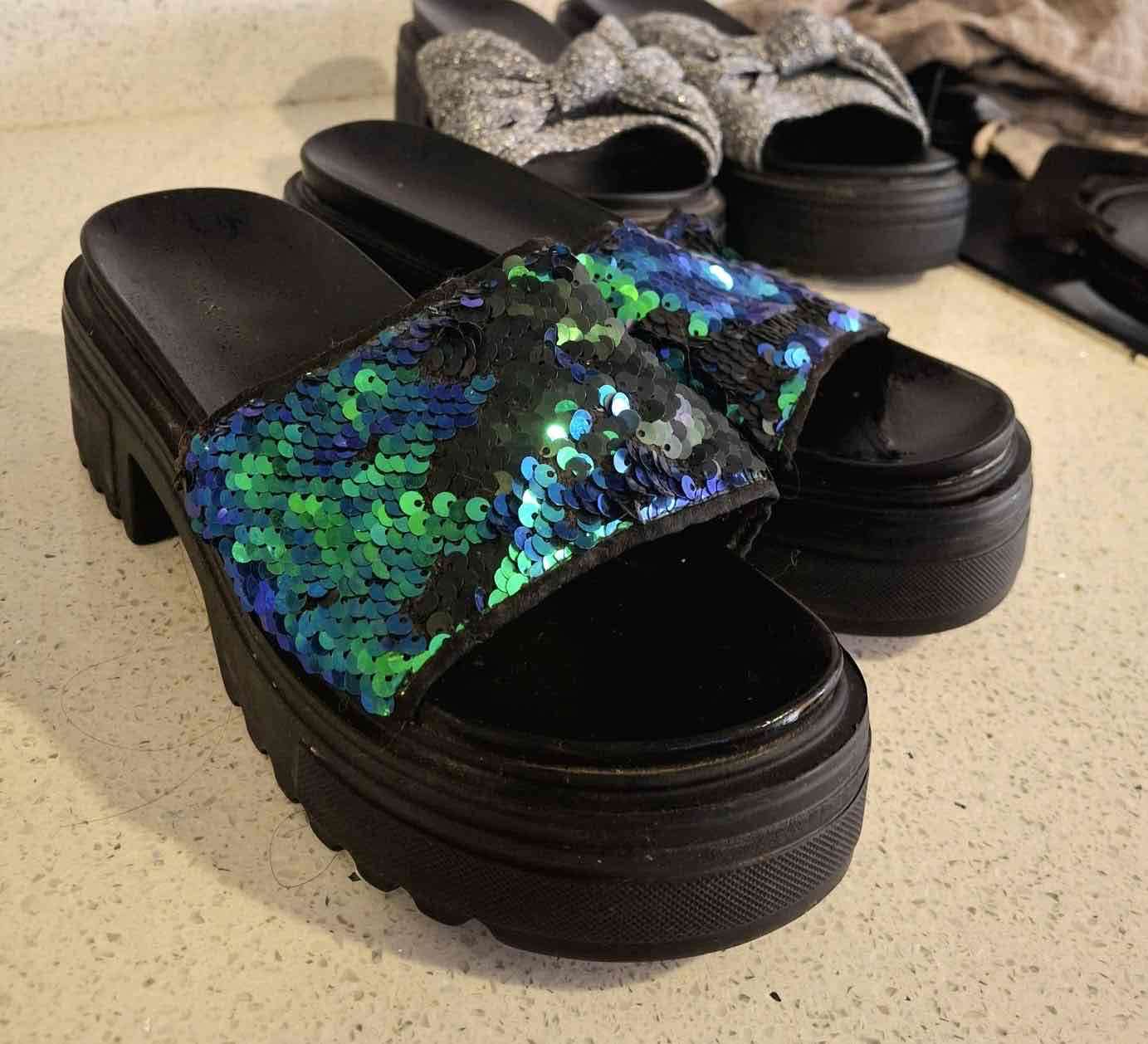 Sandalias negras con diseño de lentejuelas brillantes en azul y verde. Perfectas para un look casual y moderno. Buen estado general con leves signos de uso, marca Americanino. Número 38
