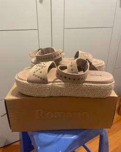 Sandalia marca Romano Nude con tachas, muy hermosa, muy juvenil 100 % cuero Reno (gamuza) , con taco de yute, talla 38. NUEVAS , SIN USO, SIN ETIQUETA