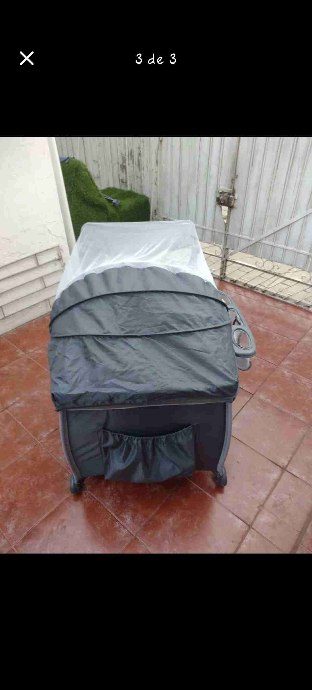 Cuna de viaje en buen estado, color gris. Ideal para transportar y brindar comodidad al bebé mientras está fuera de casa.