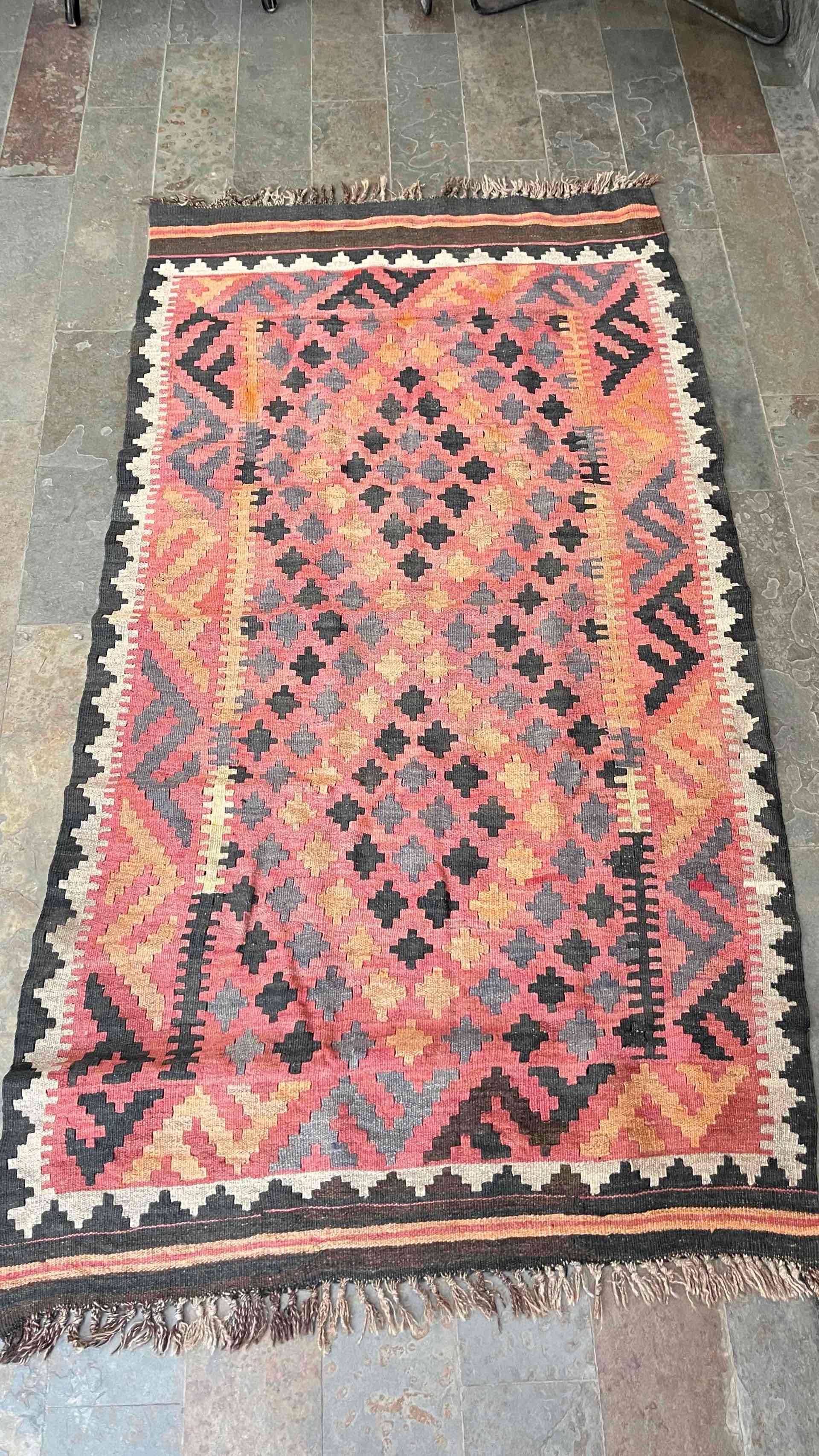 Alfombra con diseño geométrico en tonos cálidos. Perfecta para darle un toque bohemio a cualquier espacio. Buen estado general, con signos de uso leves.