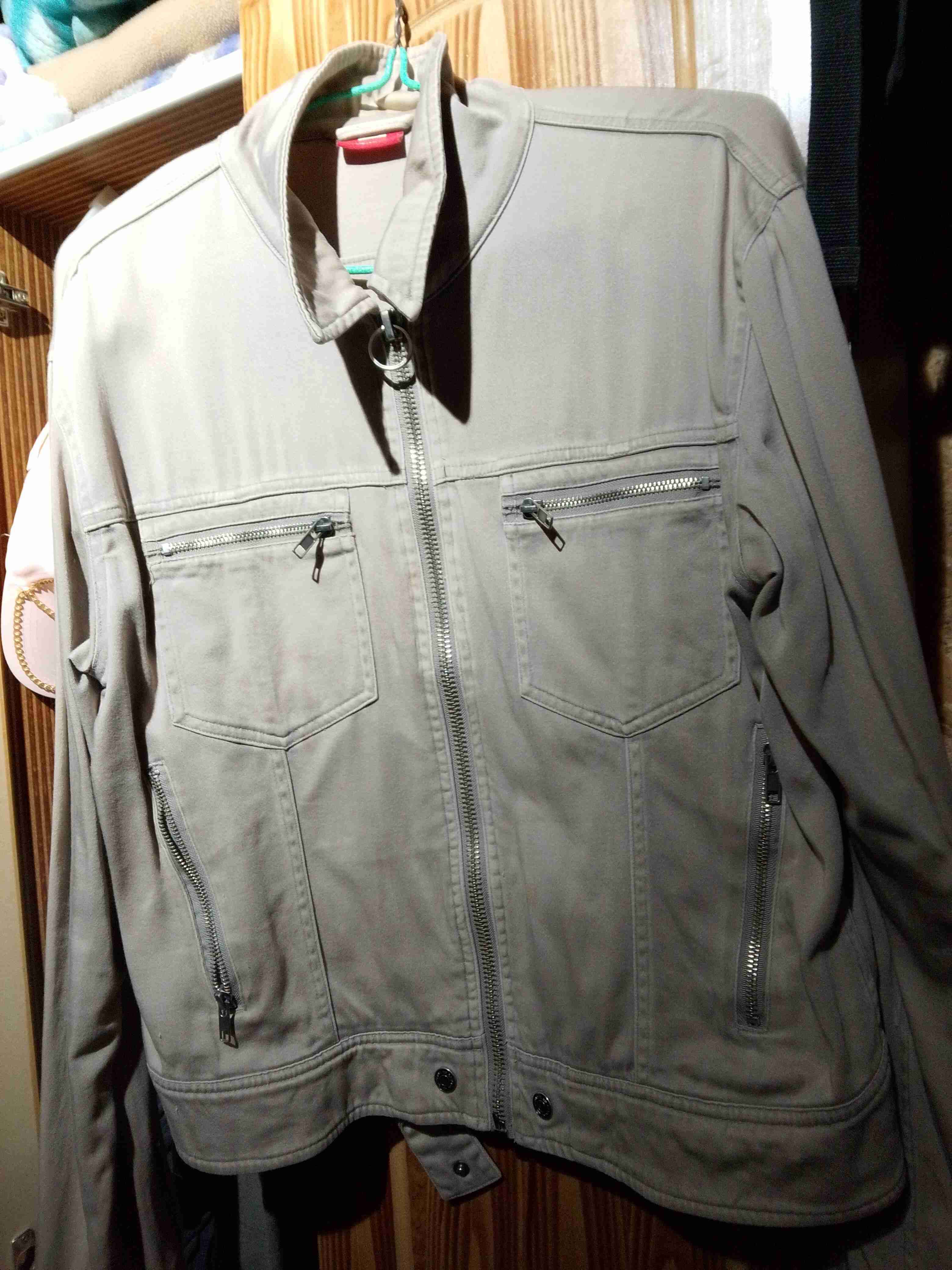 Chaqueta casual en buen estado, ideal para días frescos. Bolsillos con cierre, color beige versátil.