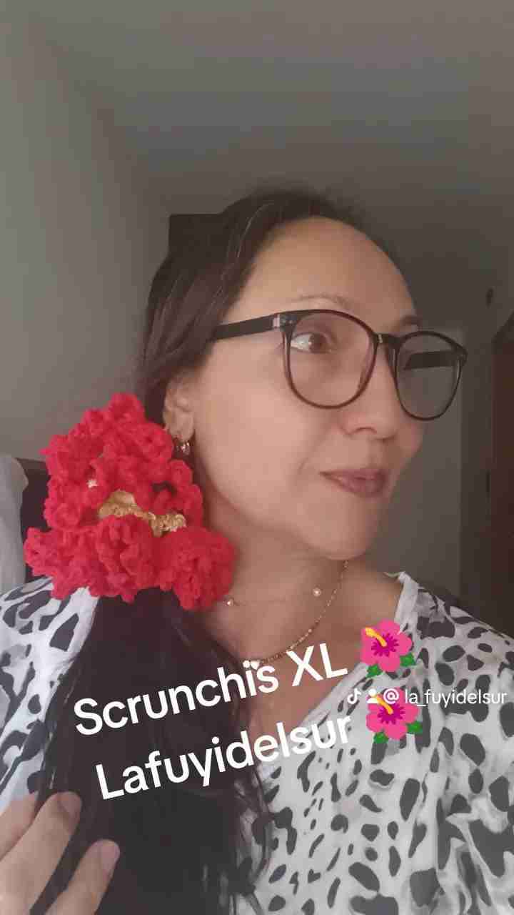 Scrunchie XL de colores vibrante con detalles decorativos. Ideal para complementar atuendos y destacar en ocasiones especiales.