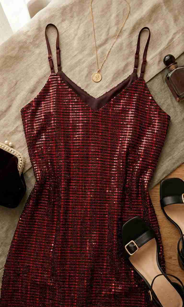 Elegante vestido de lentejuelas en color burdeo, perfecto para ocasiones especiales. Buen estado, con detalles brillantes.