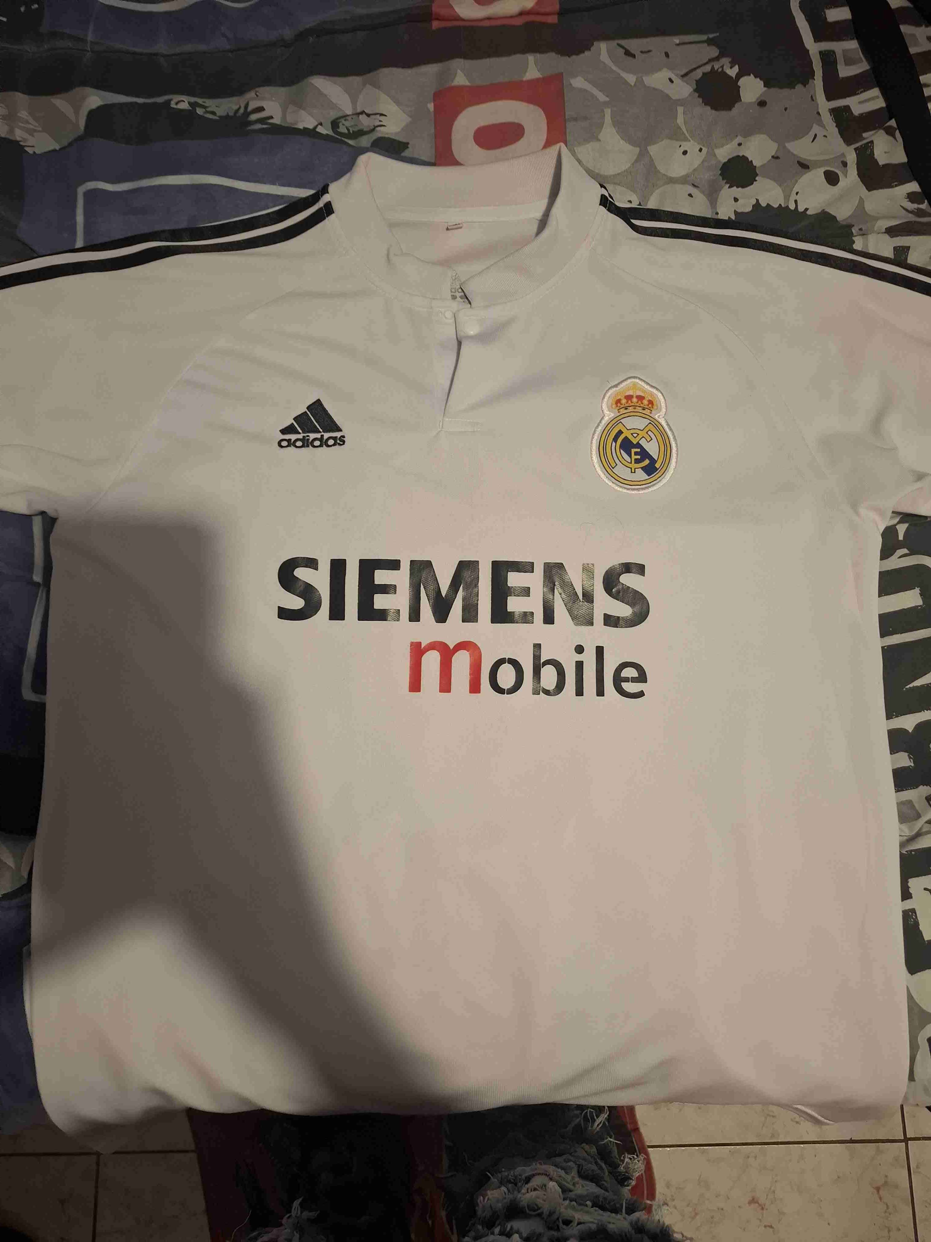 Camiseta blanca del Real Madrid con patrocinio de Siemens Mobile. En buen estado, ideal para coleccionistas o fanáticos del fútbol.