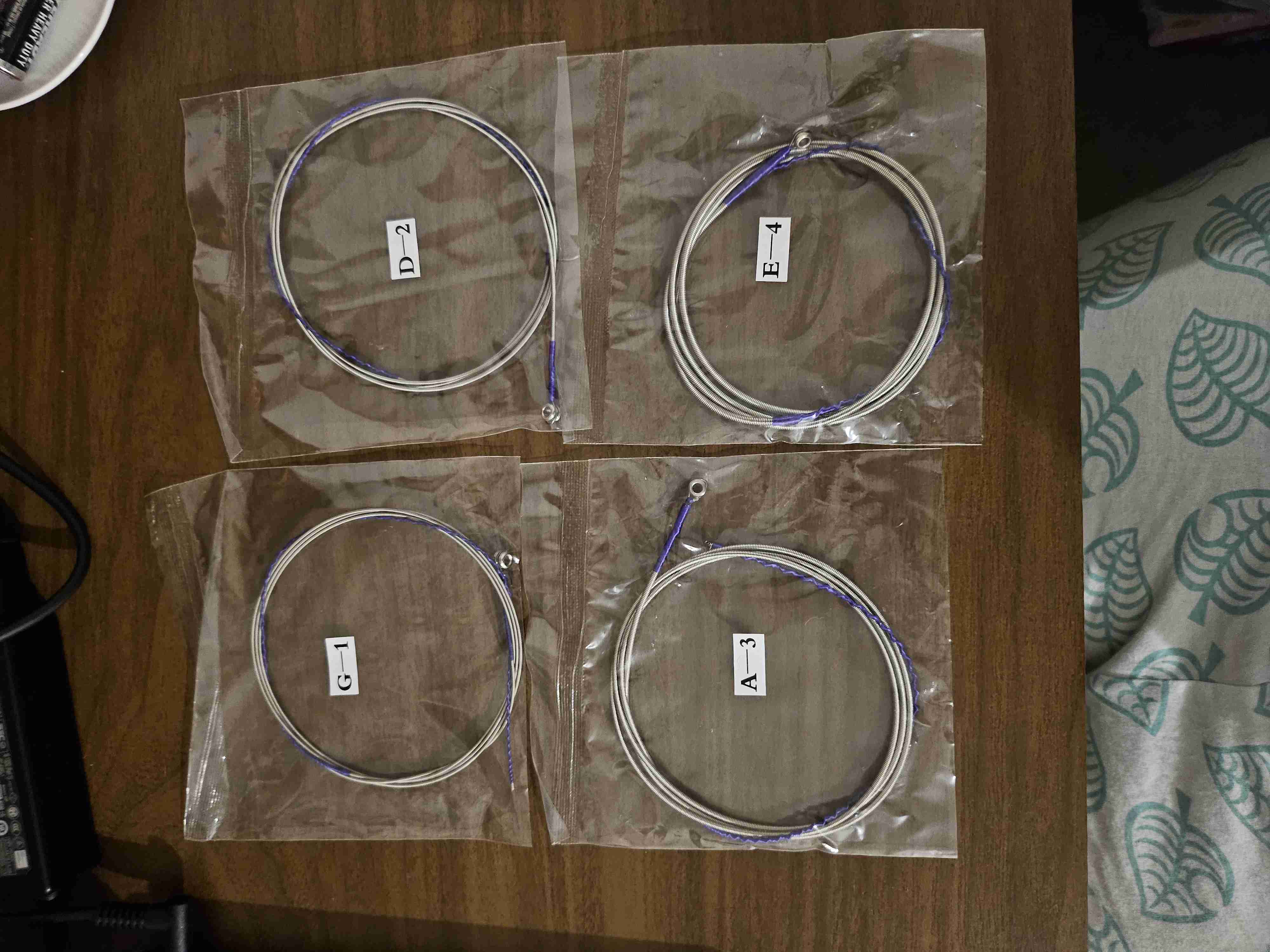 Conjunto de cuerdas de acero para guitarra. Incluye cuerdas G, D, A y E, nuevas y empaquetadas.