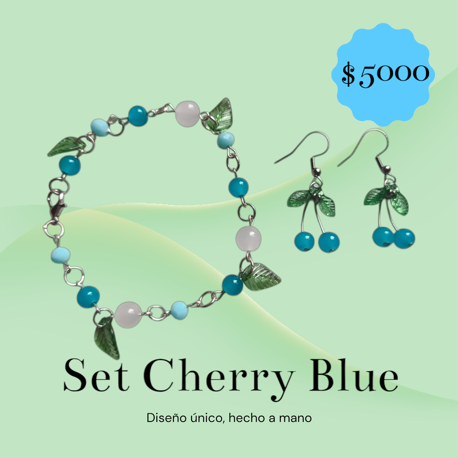Hermoso set hecho a mano, diseño único en tonos azules y verdes. Ideal para ocasiones especiales.