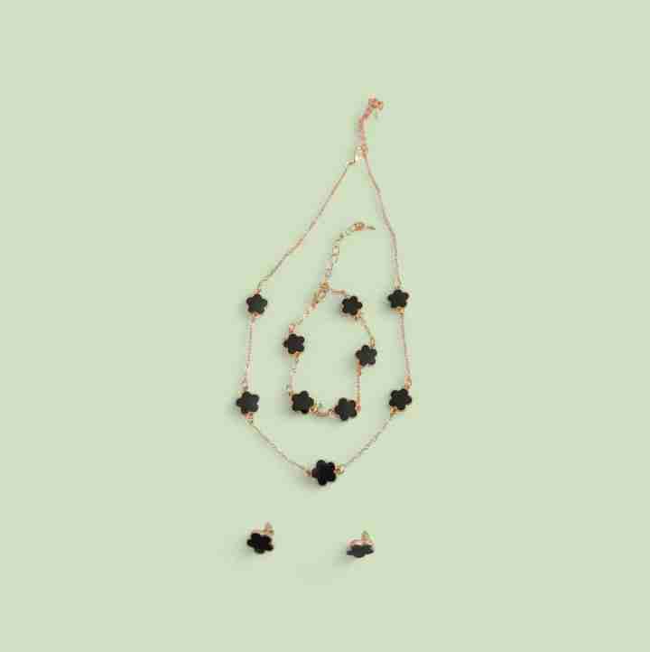 Elegante set de joyas con diseño de flores negras. Incluye collar, pulsera y aros. Ideal para ocasiones especiales.