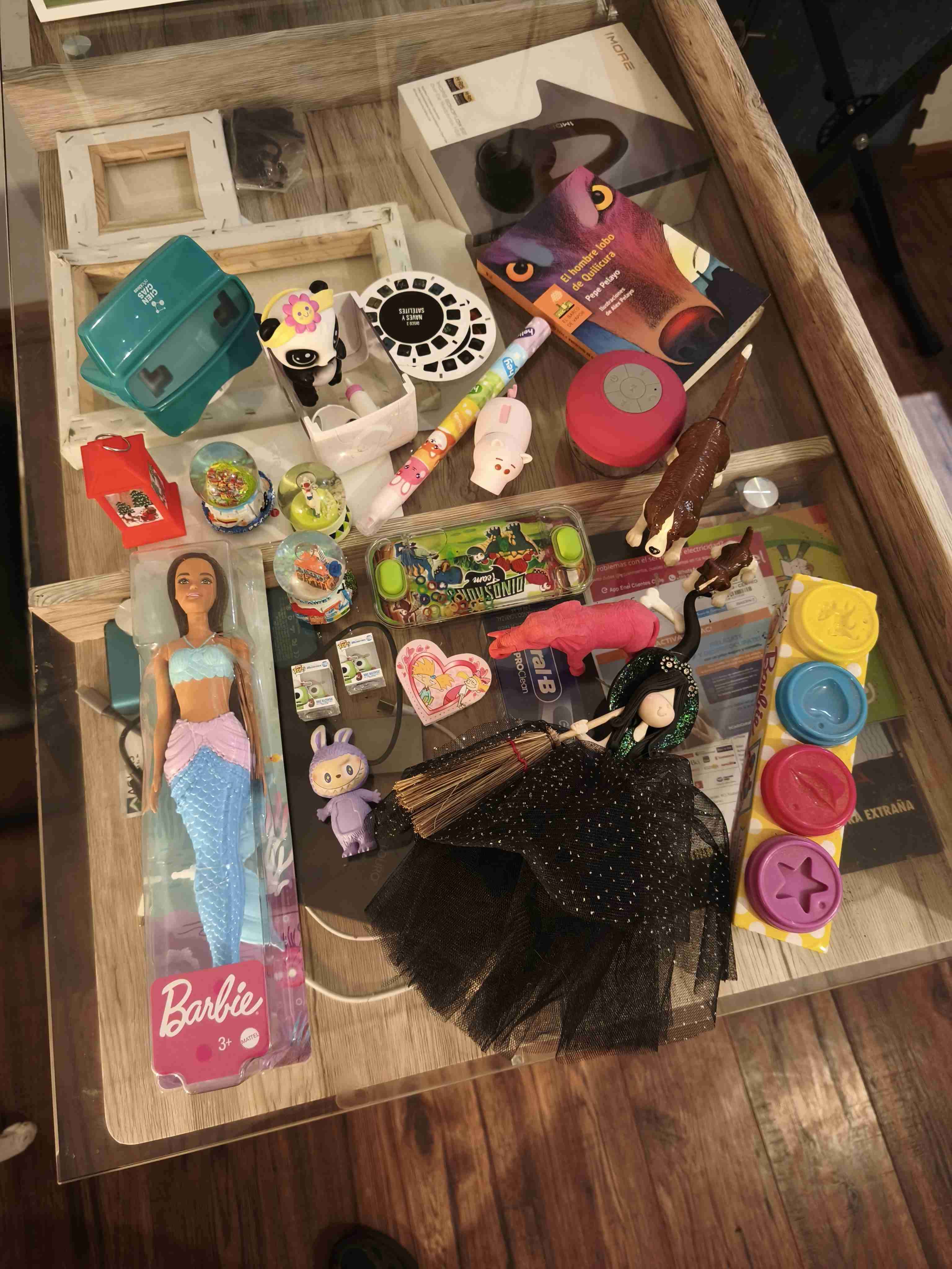 Set de más de 18 objetos. Incluye muñeca Barbie original + set de plasticina Barbie, Libro editorial Barco de Vapor ilustrado: "El Hombre Lobo de Quilicura" (Nuevo) + marca página, goma en forma de elefante rosado original Casaideas, juego burbujas noventero, figura labubu y ToyStory, esferas de nieve + llavero navideño, set de juego oso polar bebé + viewmaster de casa ideas y su set de imágenes del espacio + lápiz de múltiples colores, set perrita y cachorro Barbie, Parlante Rosa (Nuevo, jamás se uso, dos Bitty Pop original de Mike Wazowski y colgante de brujita