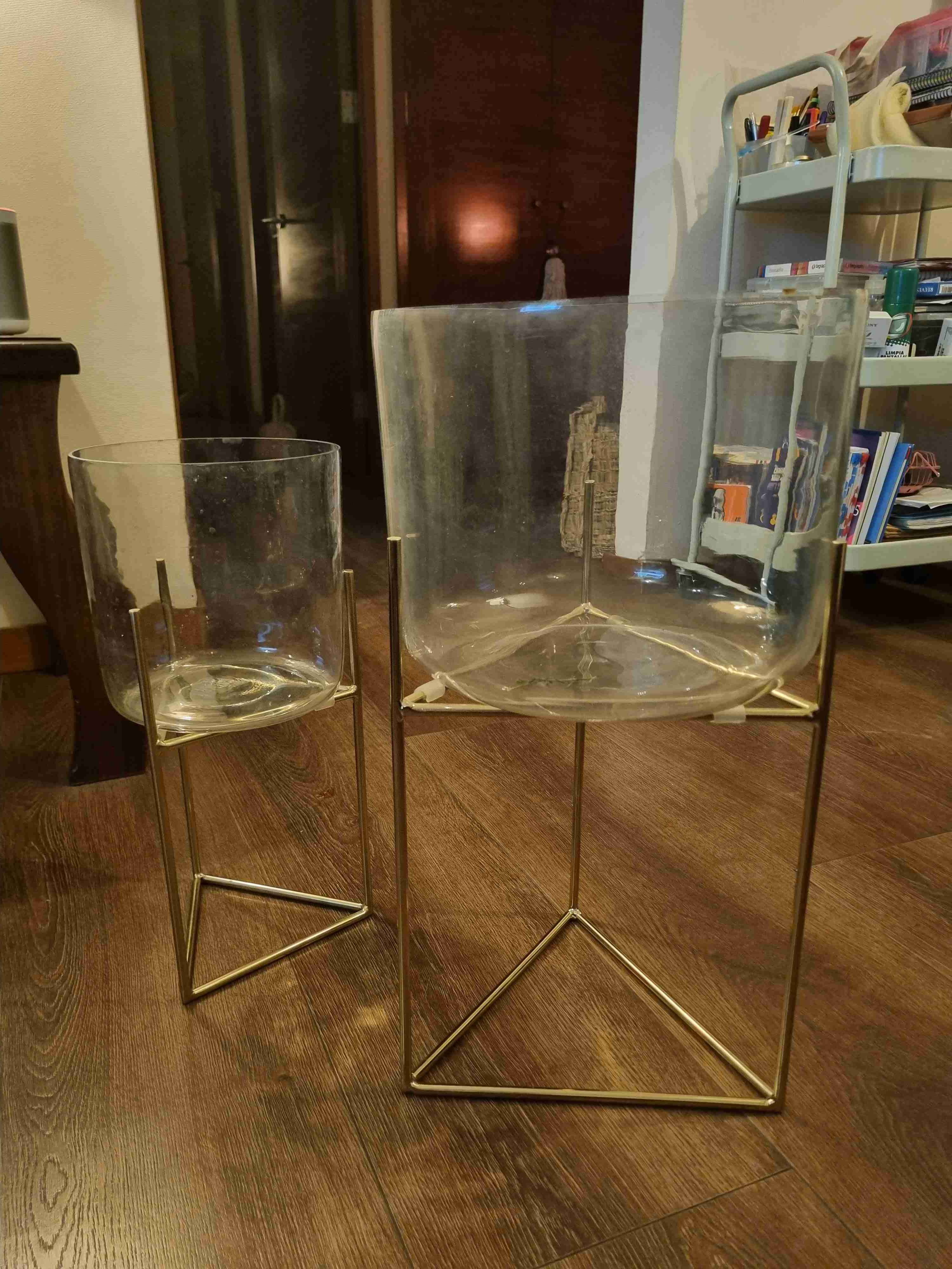 Elegante set de maceteros (2)de vidrio con soporte dorado, ideal para decorar tu hogar. En buen estado, perfecto para plantas de interior o decoración