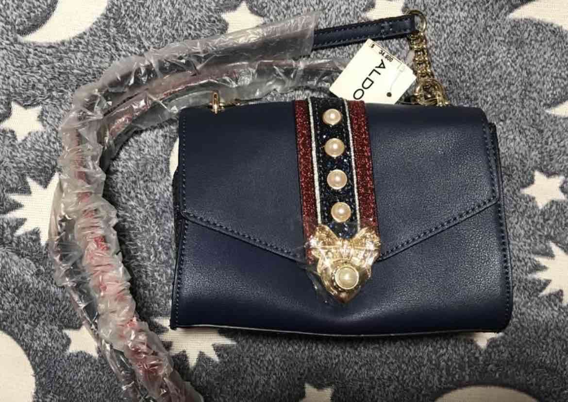 Cartera elegante color azul con detalles dorados y pedrería, ideal para eventos y salidas nocturnas. Estado nuevo y sin uso.