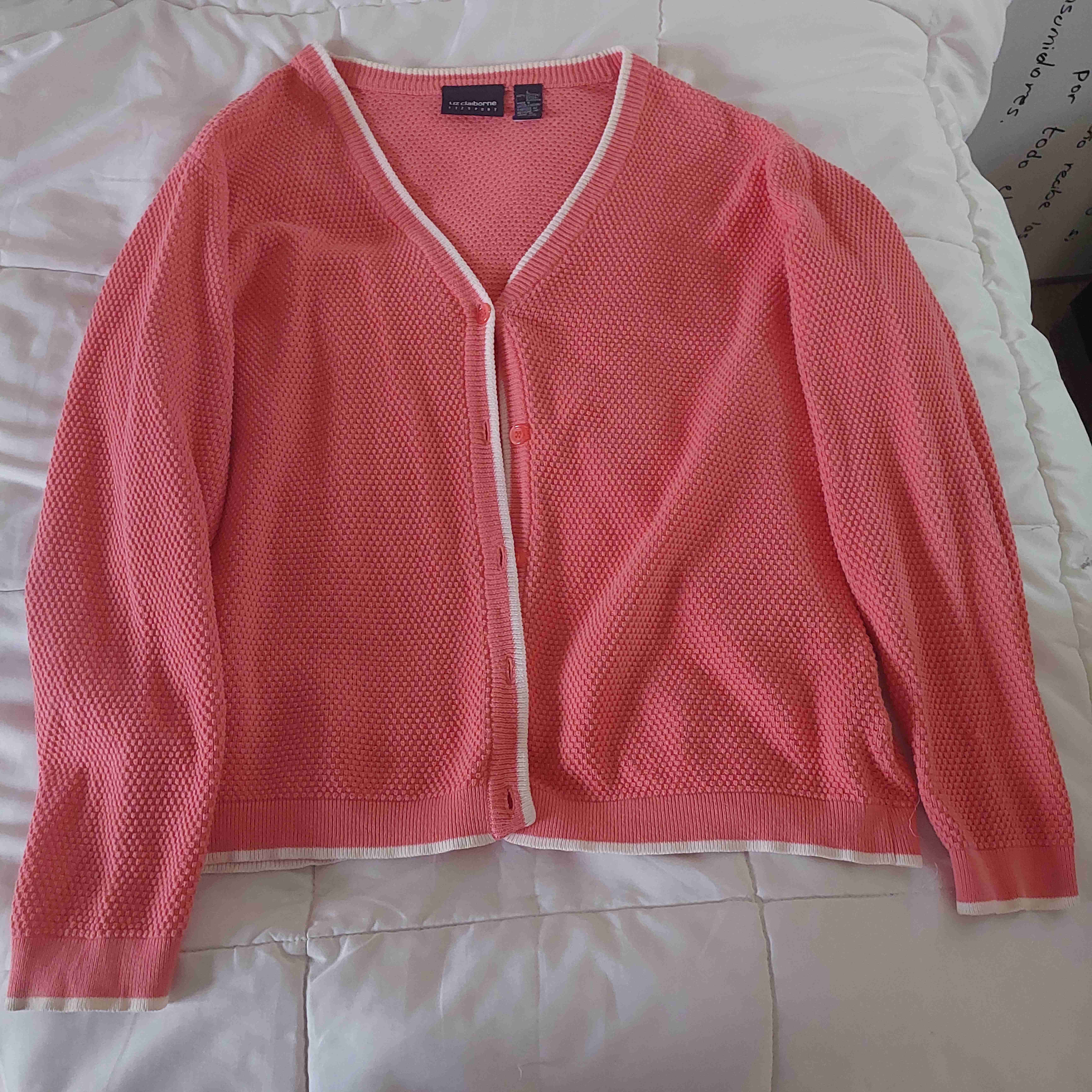 Cardigan tejido rosado, ideal para días frescos. En buen estado general. Talla L