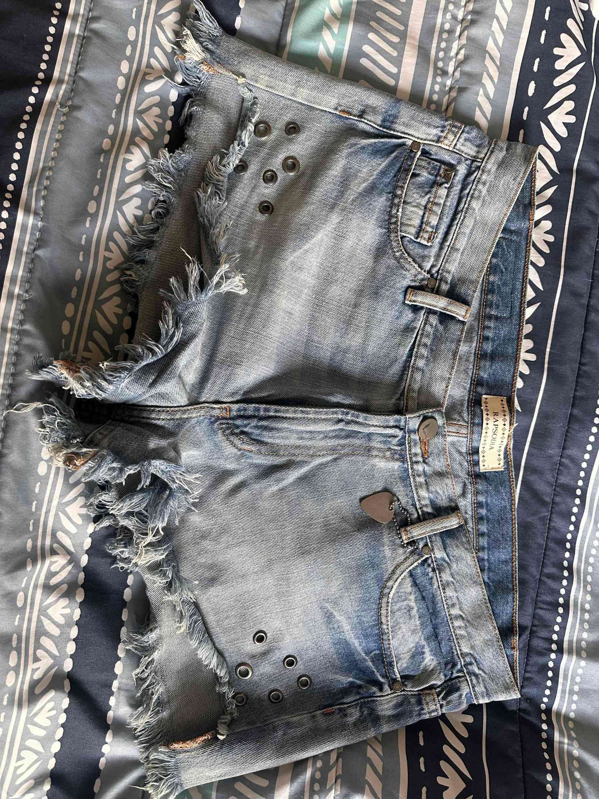 Shorts de jean con estilo desgastado y detalles metálicos. Ideal para el verano, en buen estado.