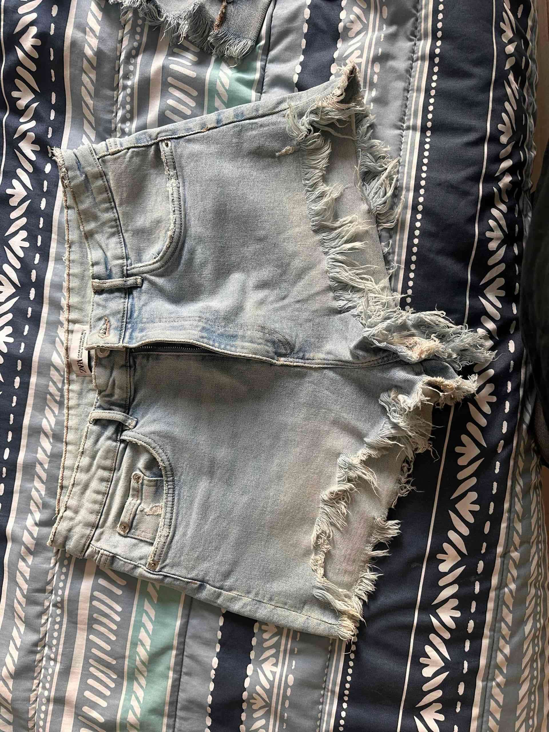 Shorts de mezclilla azul claro con detalle desgastado. Ideal para un look casual y relajado. En buen estado general.