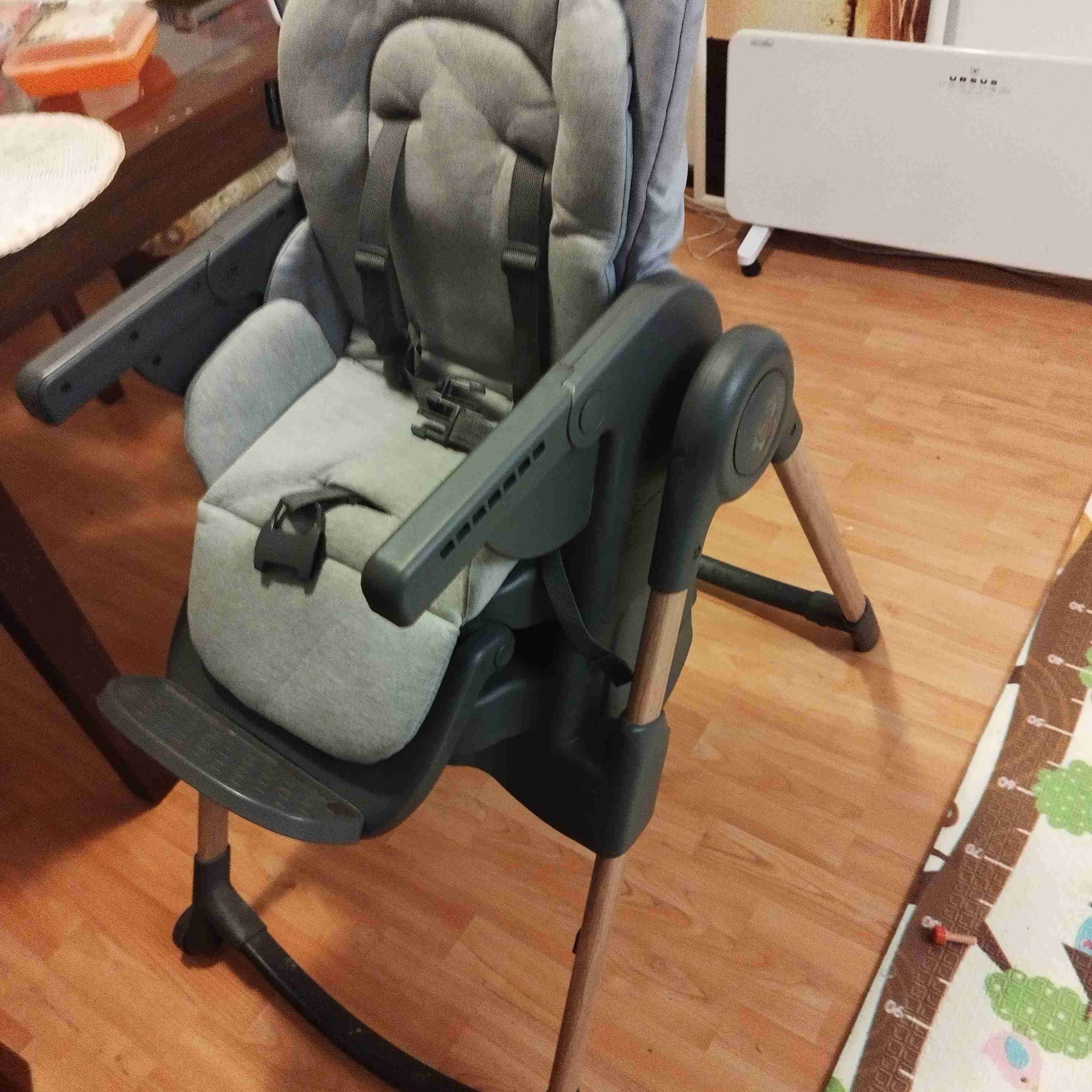 Silla de comer ajustable, en buen estado. Ideal para la hora de comida del bebé, con arnés de seguridad. Se puede desmontar, sirve tanto para instalar en cualquier silla y la base se puede usar para asiento de niños más grandes. Tiene detalle en la.bandeja protectora, no afecta el uso.
