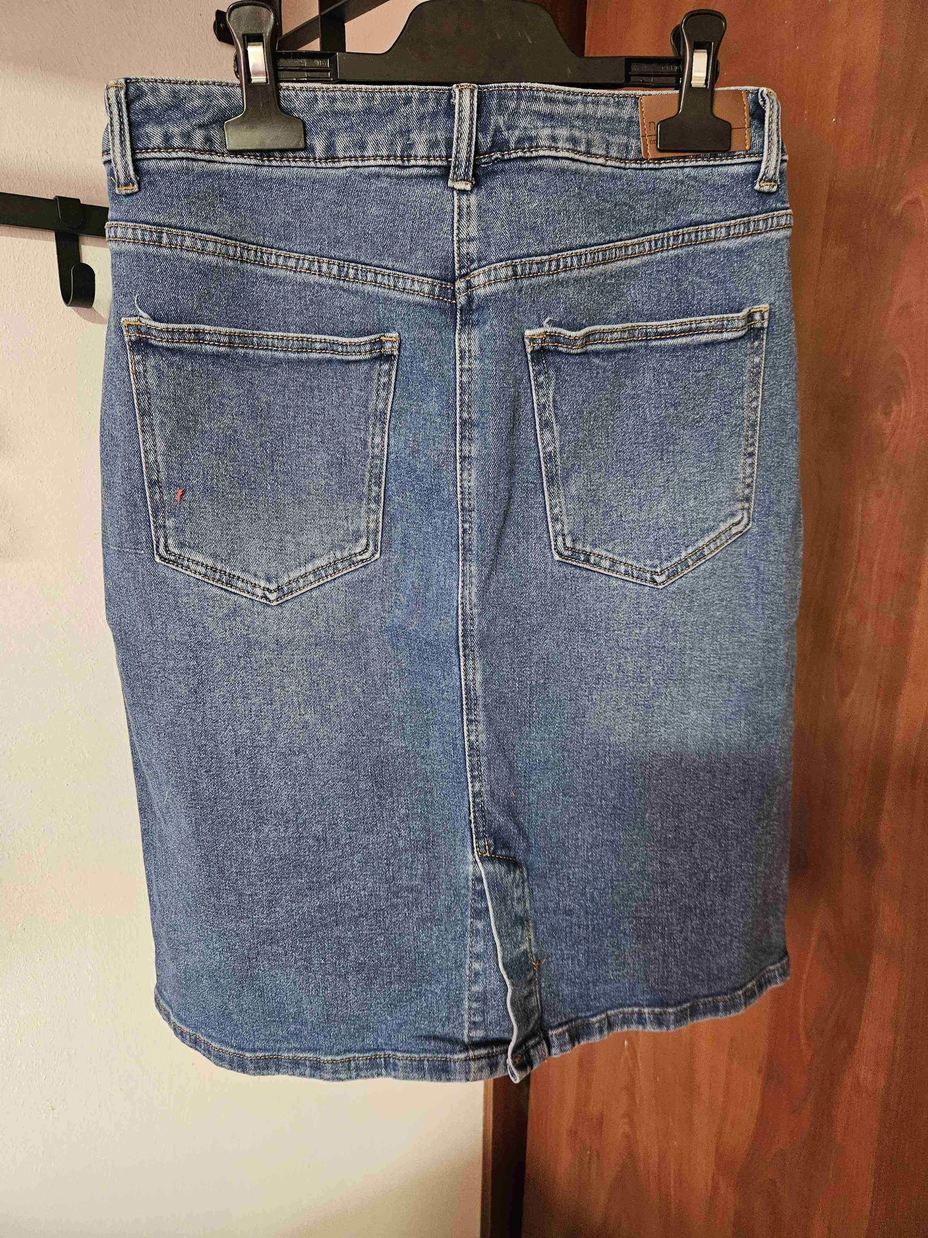 Falda de mezclilla clásica en color azul. En buen estado solo un uso, con bolsillos, ideal para uso diario.