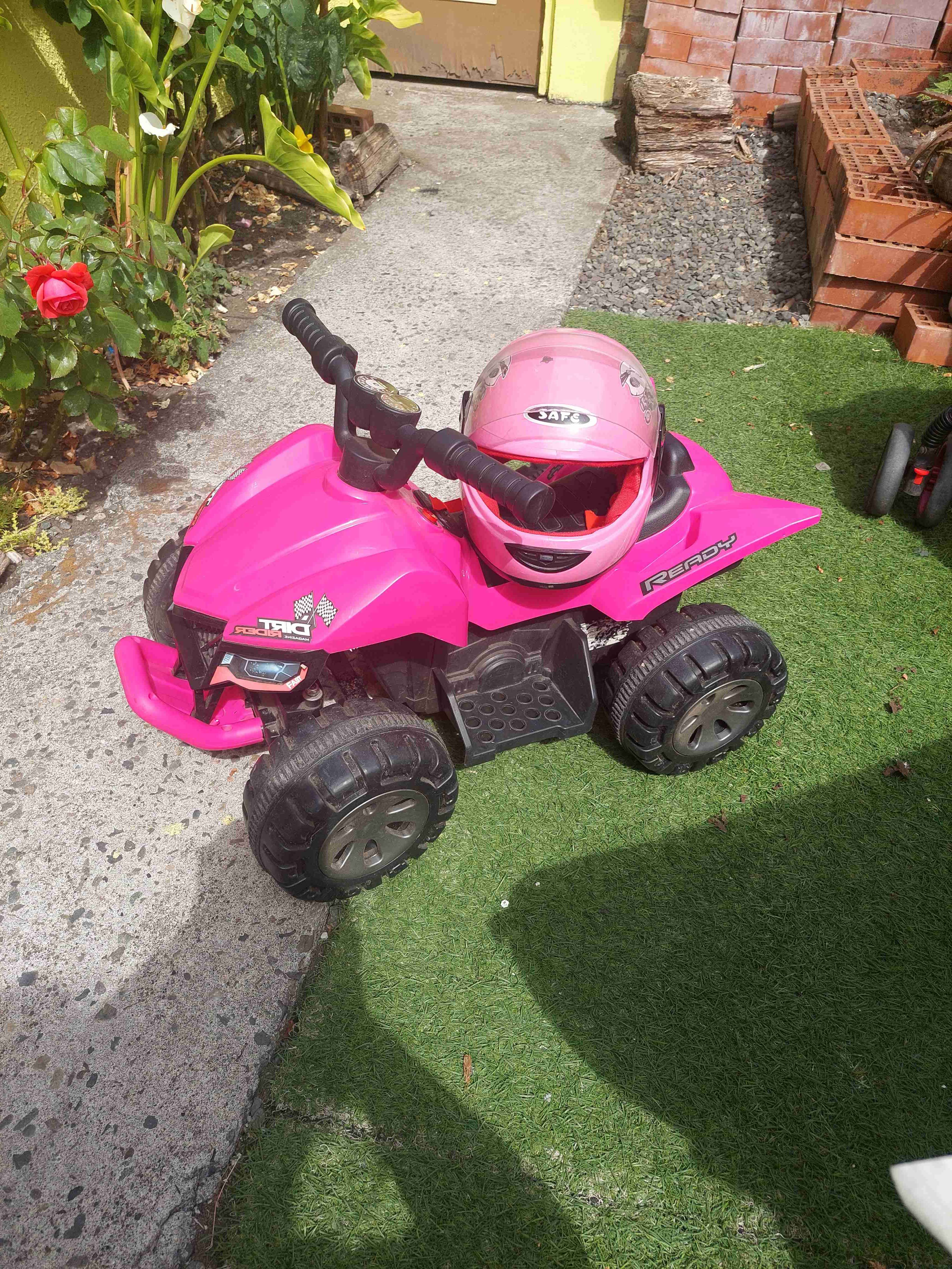 Cuatrimoto rosa para niños, ideal para el jardín. Incluye casco. En buen estado con uso normal. Incluye casco protector.