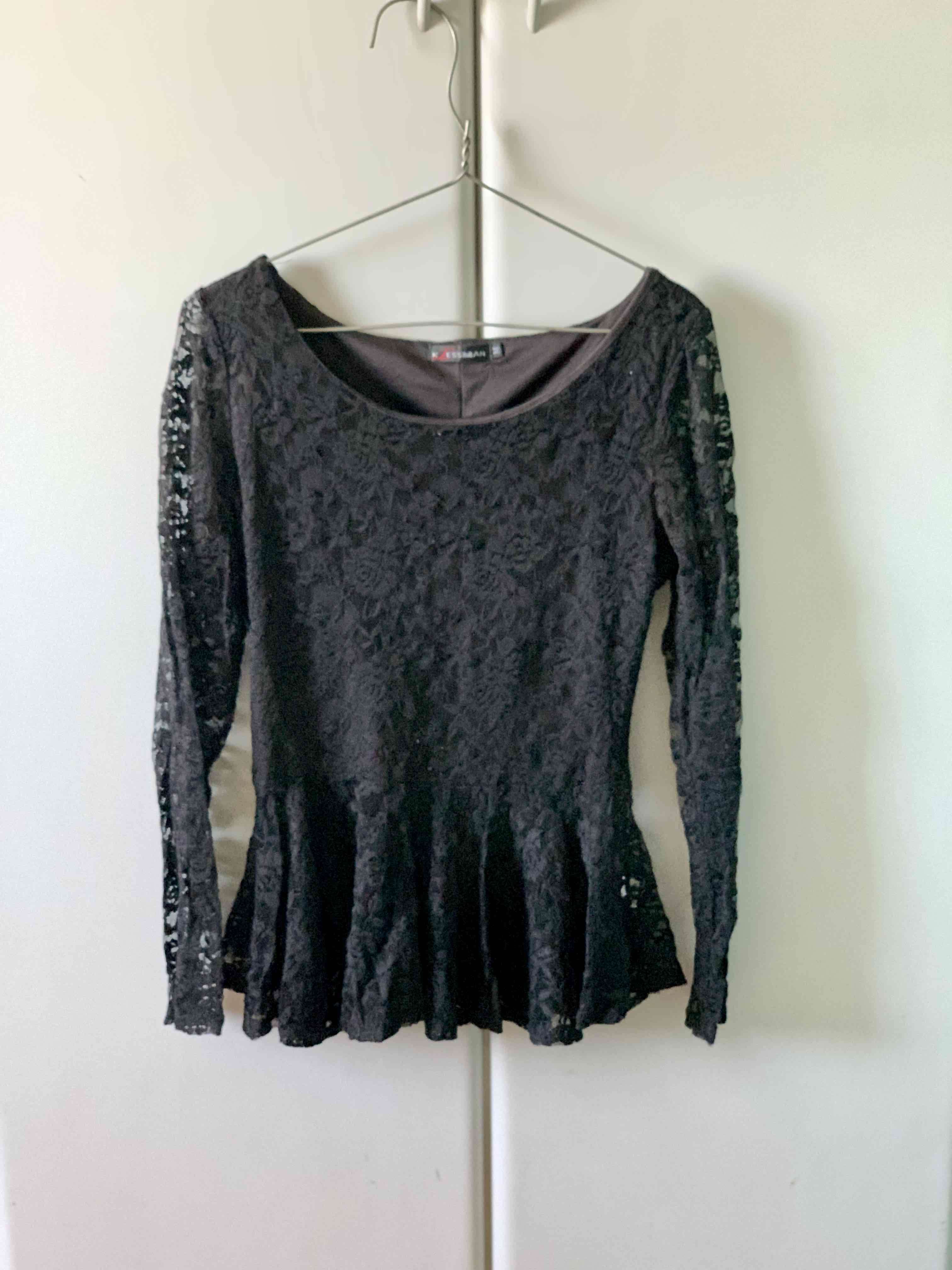 Blusa negra de encaje con mangas largas, ideal para ocasiones especiales. En buen estado.