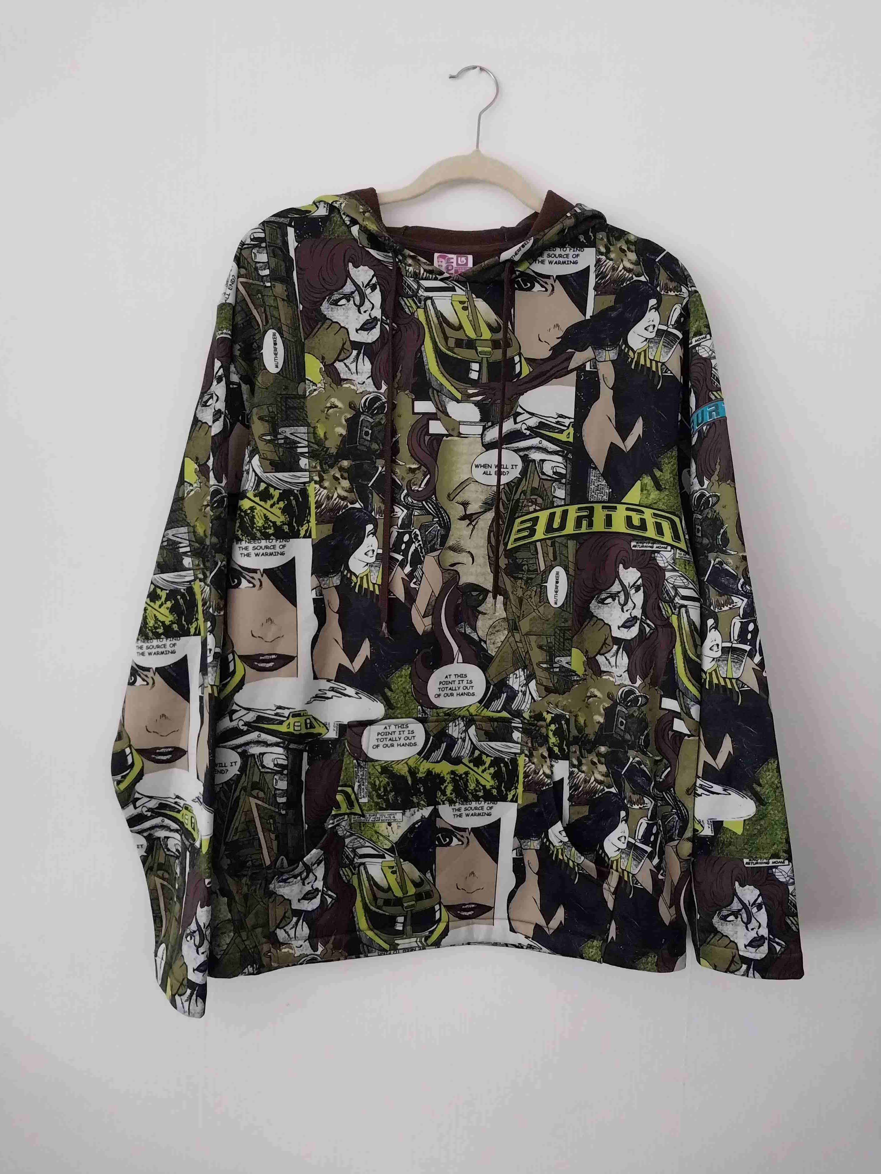 Polerón con capucha y diseño de cómic. En buen estado y perfecto para un estilo casual y original. Detalles en la última foto, tiene unas marcas de costuras qué apenas se notan. Talla M pero es más como un L