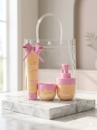 Set de cuidado capilar Honey Glow con shampoo, acondicionador y mascarilla. Perfecto para un cabello suave y brillante. Incluye bolso transparente.
