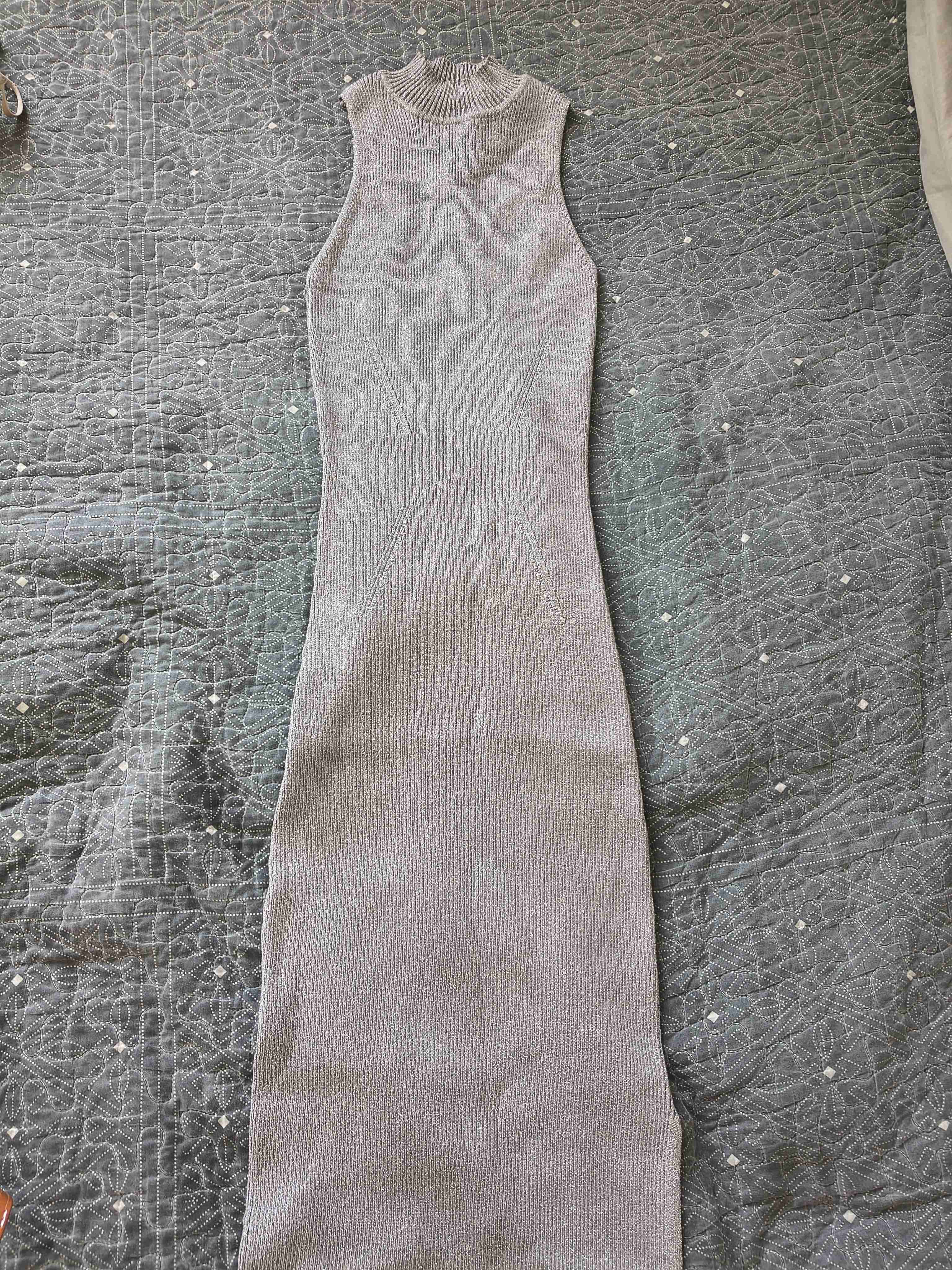Vestido ajustado de punto gris, ideal para ocasiones casuales. En buen estado, suave al tacto. Es gris con brillos, apegado al cuerpo
