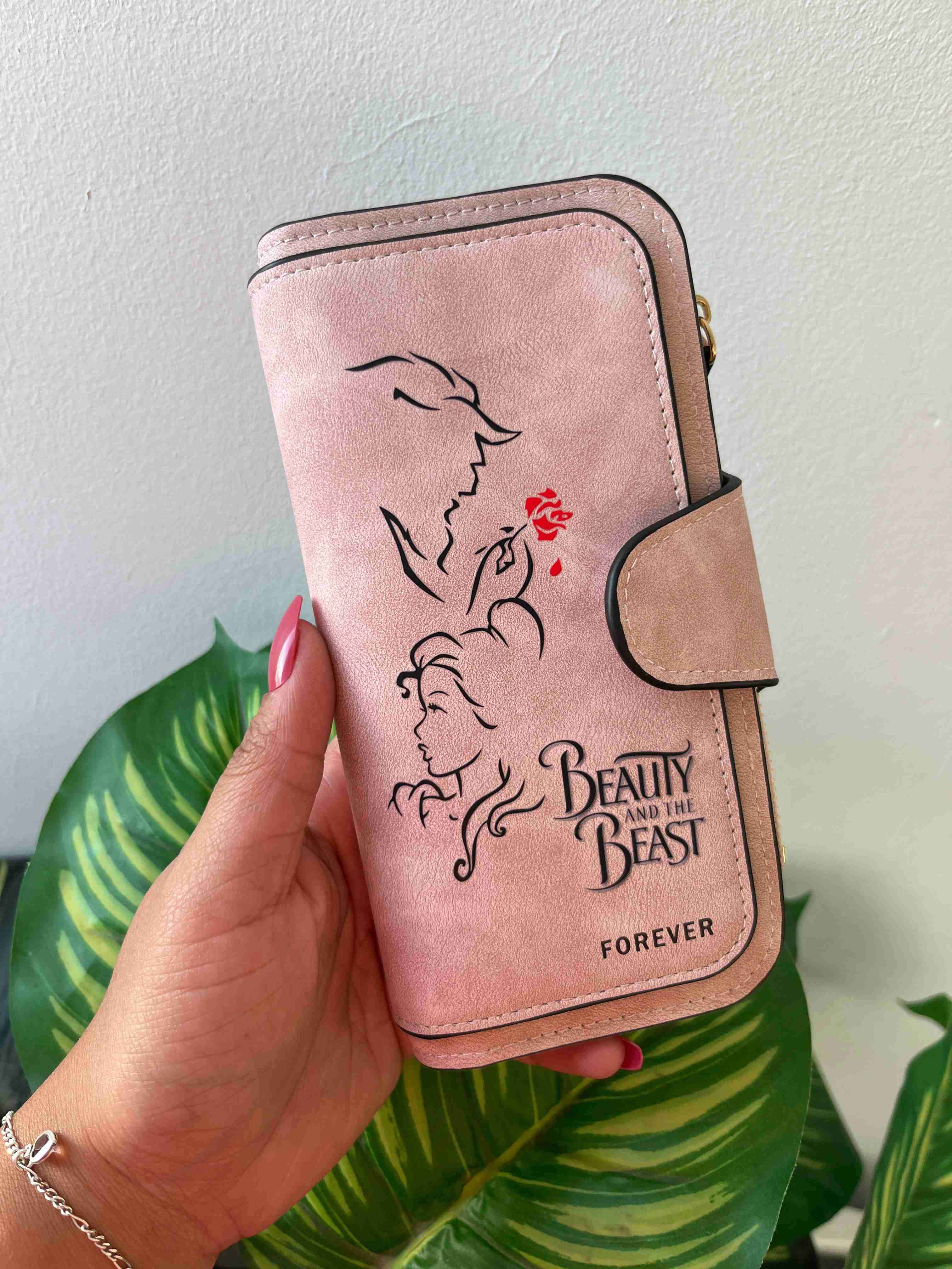 Cartera estilo billetera rosada con diseño de La Bella y la Bestia. Ideal para fanáticos, en buen estado.